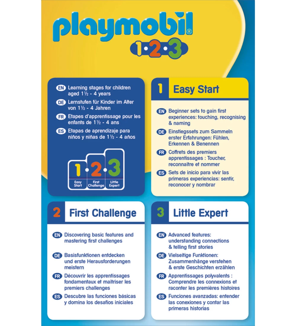 Playmobil 1.2.3-sættene er inddelt i tre læringstrin, der bygger oven på hinanden: Easy Start, First Challenge og Little Expert. Hvert læringstrin fremmer barnets udvikling gennem leg.