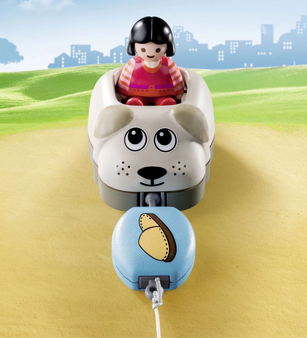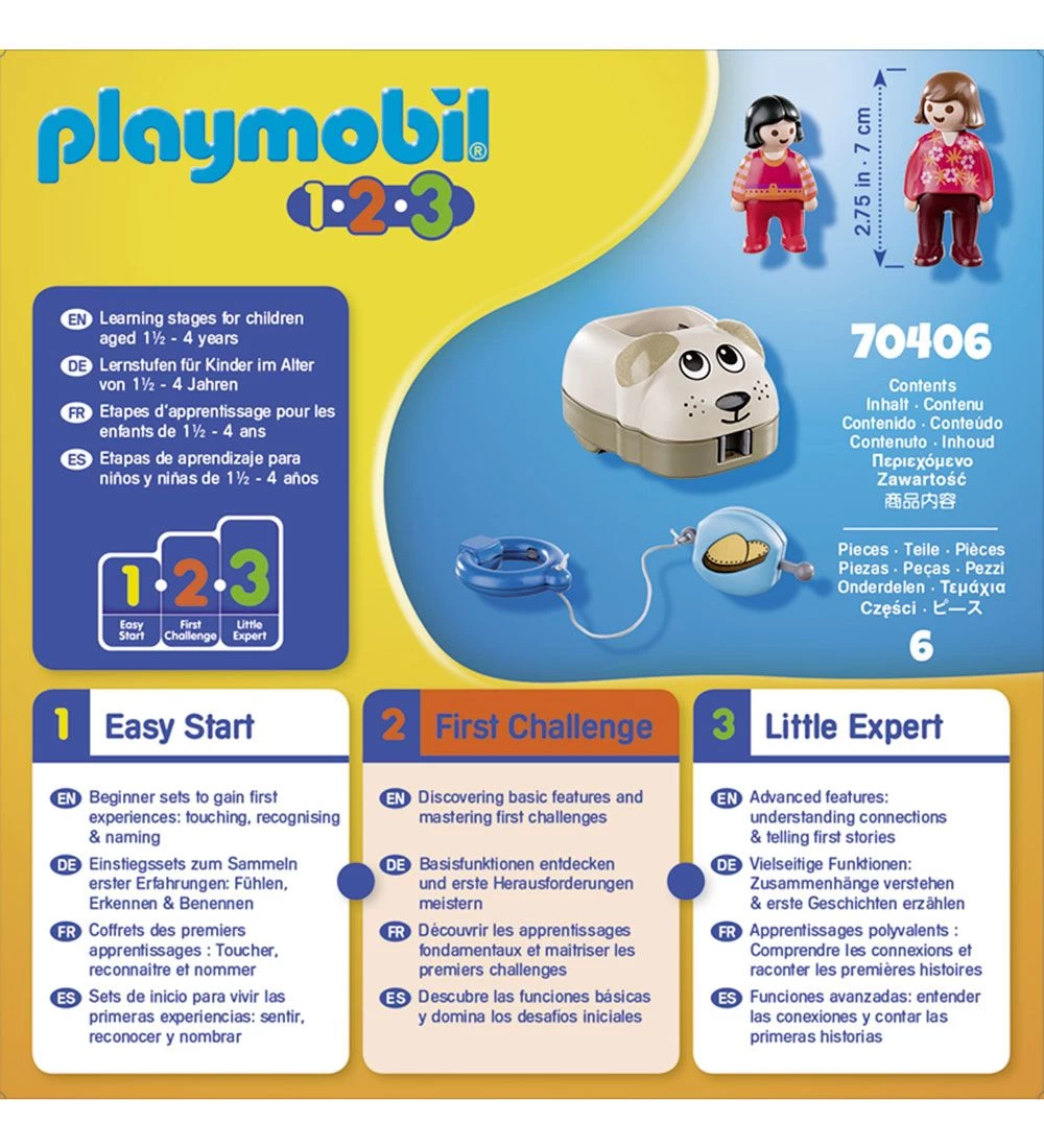 Skønt Playmobil 1.2.3 sæt med i alt 6 dele, der tilsammen udgør en sød trækhund med en mor og datter.