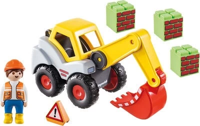 Et gravemaskinesæt til de allermindste, som indgår i PLAYMOBIL®-1.2.3 fra Playmobil. Gravemaskinens tag kan åbnes, så bygningsarbejderen let kan hoppe ind og begynde arbejdet, og den bevægelige arm gør det let at laste og transportere murstenene! Gravemaskinens arm kan også indstilles i flere forskellige positioner. I sættet indgår en bygningsarbejder, en gravemaskine, tre mursten samt et advarselsskilt. Dette farverige legetøjssæt fremmer dit barns kreativitet og finmotorik samt opmuntrer fantasien!