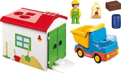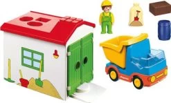 Et skraldebilssæt med garage til de allermindste, som indgår i PLAYMOBIL®-1.2.3 fra Playmobil. Skraldemanden hopper ind i skraldebilen og bakker ind i sorteringsgaragen. Her lastes anhængeren gennem garagetaget! Skraldespanden, sækken og pakken har alle sine egne sorteringshul, der er tilpasset efter deres form. Ved aflastningen kan tipvognen sænkes ned. Garagen har et indbygget skinnesystem og kan også bruges som remiser.