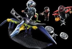 Et sjovt Dino Rise-legetøjssæt fra Playmobil. Denne cool dinosaur har et sikkerhedsnet, der kan bruges til at uskadeliggøre fjenderne. Figuren, Jaden, kan ride på Pteranodon, og sammen kæmper de mod fjenden. Et sejt kamppar, der modigt stiller sig i vejen for de onde kamprobotter!