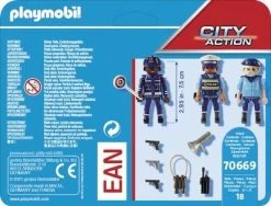 Et sjovt legesæt fra Playmobil med tre politibetjente i forskelligt tøj og med forskelligt udstyr. Med skydevåben, kikkert og megafon er de klar til at håndtere bøller og banditter, for at sætte dem bag lås og slå.