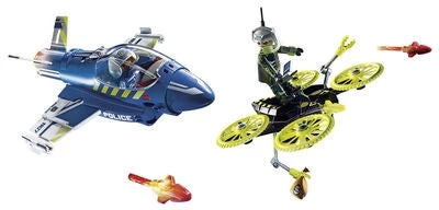 Legesæt fra Playmobil fra serien City Action med en forbryder på flugt, der forsøger at undgå politiet med en superdrone. Politien jagter ham med en superjet og spændingen stiger – hvordan vil det mon gå? Sættet indeholder flere sjove dele og kan kombineres med andre legesæt fra Playmobils City Action-serie.