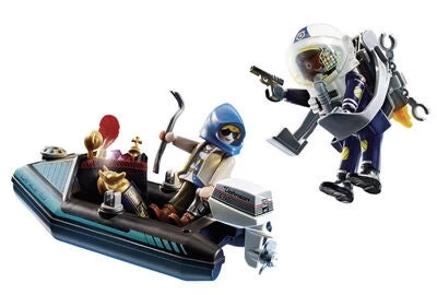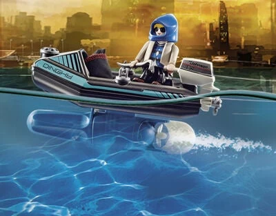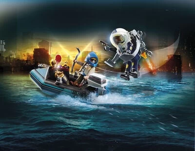 Legesæt fra Playmobil fra serien City Action med en forbryder på flugt i sin gummibåd. Politiet jagter ham med sin jetpack. Vil det lykkedes politiet at gribe forbryderen og sætte ham bag tremmer? Sættet indeholder flere sjove dele og kan kombineres med andre legesæt fra Playmobils City Action-serie.