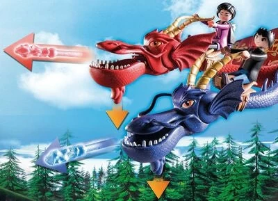 71080 legesæt fra Playmobil med 40 dele. 1.300 år efter begivenhederne fra Sådan træner du din drage-filmene, er drager stadig blot legender i den moderne verden. En gruppe teenagere opdager sandheden om drager og finder deres gemmested – en hemmelighed, som de må holde for sig selv for at beskytte deres opdagelse. Wu & Wei er en kinesiskinspireret drage med to personligheder – en aggressiv og en rolig side. Wu & Wei har bevægelige ben, hoveder og halse. De store vinger kan vrides begge veje. Sadlerne lader Jun og Eugene ride på dragens ryg. En ild- eller ispil kan affyres fra de to dragehoveder ved at trække i fipskægget.