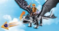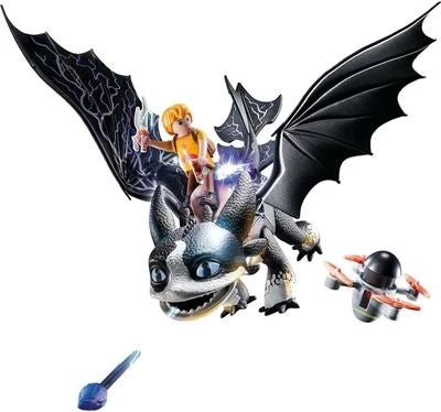 71081 legesæt fra Playmobil med 39 dele. 1.300 år efter begivenhederne fra Sådan træner du din drage-filmene, er drager stadig blot legender i den moderne verden. En gruppe teenagere opdager sandheden om drager og finder deres gemmested – en hemmelighed, som de må holde for sig selv for at beskytte deres opdagelse. Thunder kan bevæge alle fire ben, såvel som hoved og vinger. Den integrerede sadel gør, at Tom kan ride på Thunders ryg. Thunders rygkam er udstyret med et lysmodul, og han kan skyde plasmapile ud af munden.