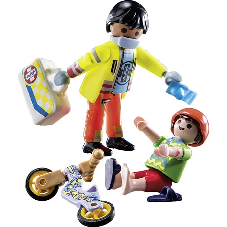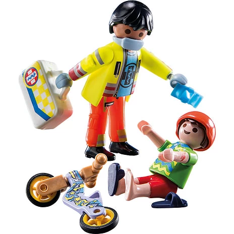 Paramedicineren behandler den tilskadekomne dreng med plaster og skinneforbinding.