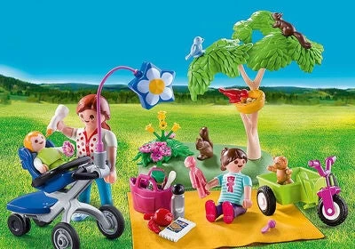Begiv dig ud på familiepicnic med dette sjove legetøjssæt fra Playmobil! Sættet indeholder mor og to små børn, barnevogn, trehjulet cykel, og alt du behøver for en vellykket picnic. Giv babyen mad, leg med de medfølgende dyr og spis den rigtig lækre mad.