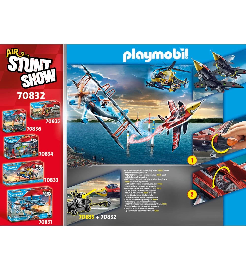 Med den flotte flyvemaskine i et ørne-design bliver der lavet vilde luftstunts på kunstflyvningsbanen. Flyvemaskinen har en drejeligt motorturbine bagtil, som drives af en en optræksmotor. Der medfølger også pyloner, der kan “ødelægges” for dramatisk effekt, samt en figur og sejt tilbehør. Sættet kan kombineres med Playmobil Air Stuntshow sættet “Mobil reparationsservice – 70835”.