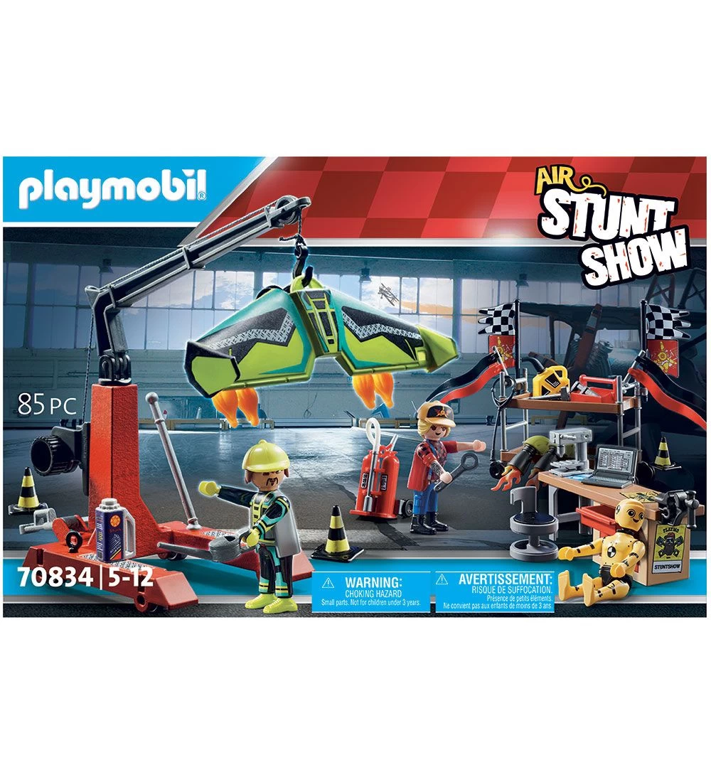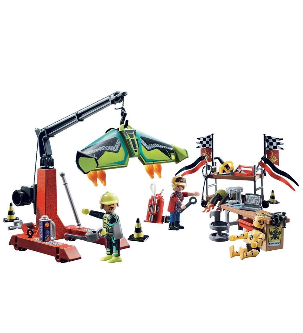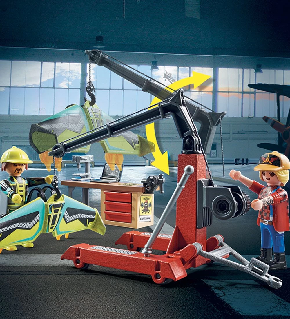Flyvemaskinerne kan blive repareret af de to figurer på servicestationen, som inderholder både en mobilkran med spil og wingsuit samt en masse sejt tilbehør. Mobilkranen kan kombineres med servicebilen fra Playmobil Air Stuntshow sætter “Mobil reparationsservice – 708351”.