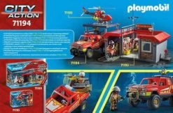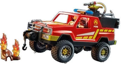 City Action brandbil fra Playmobil med en brandmand. Den har en træstamme med flammer, som brandbilen kan slukke og andet tilbehør. Brandbilen har en slange med en vandtank, der kan fyldes med rigtigt vand, så man kan sprøjte det mod plastikflammerne. Perfekt til mange timers sjov.