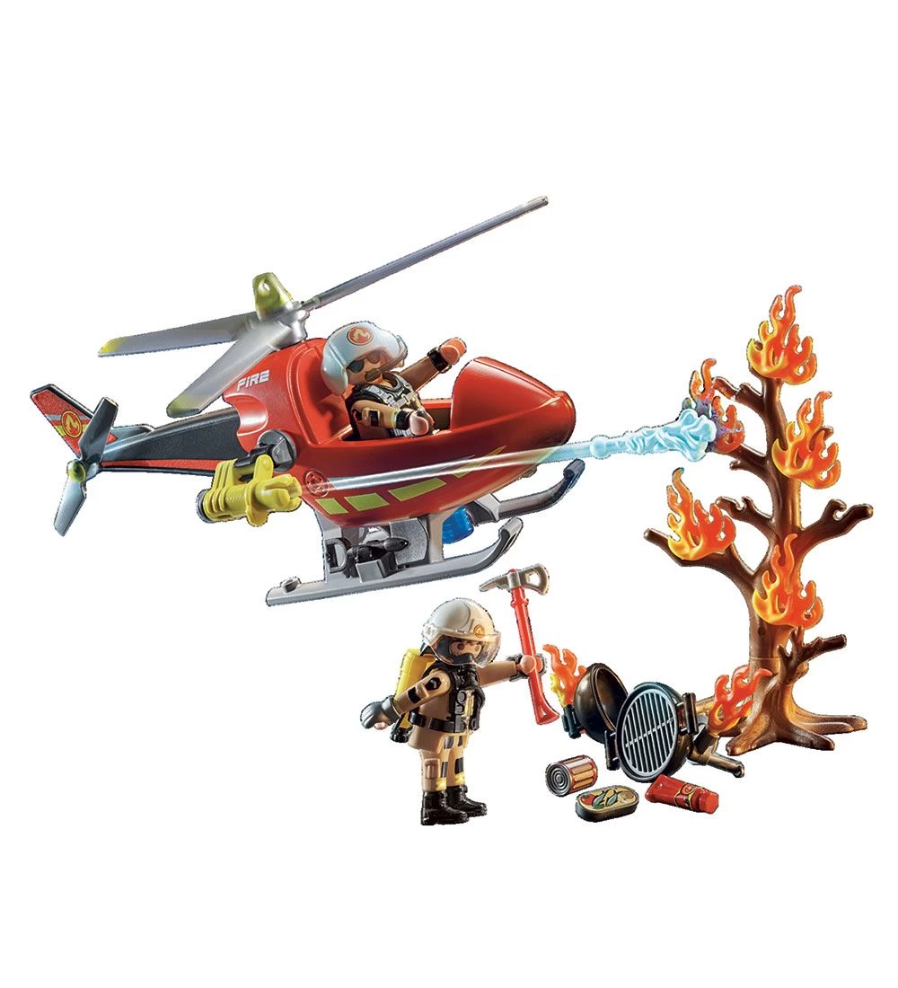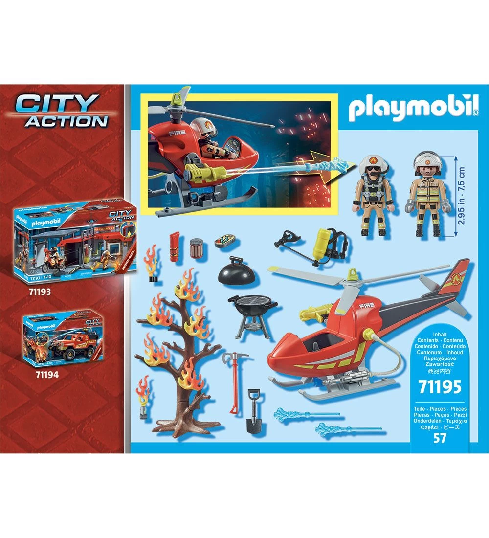 Brandmændene er klar til at rykke ud i deres flotte brandhelikopter med med funktionsdygtig vandkanon. Der medfølger to figurer, en brandhelikopter, et brændende træ og masser af tilbehør. Sættet et er en Promo-Pack, hvilket er det samme som limited edition.