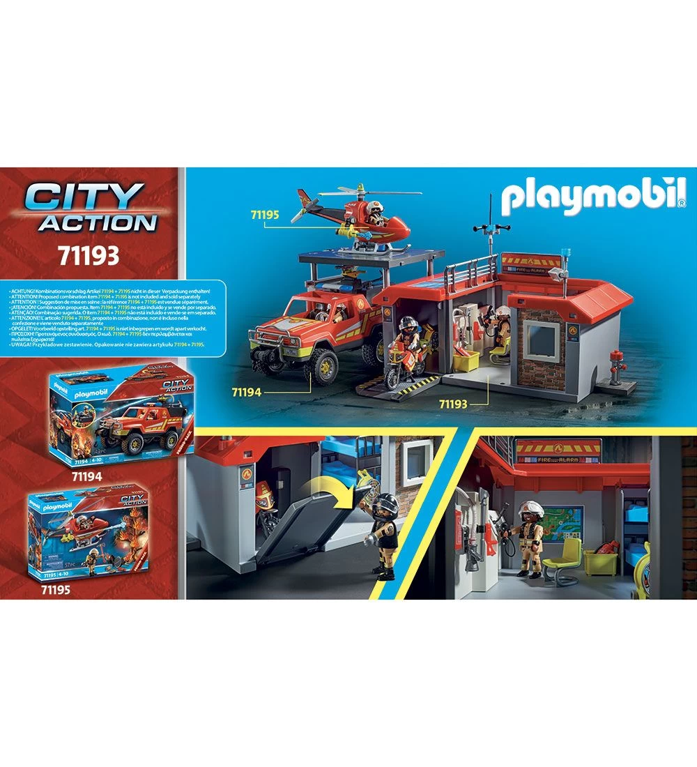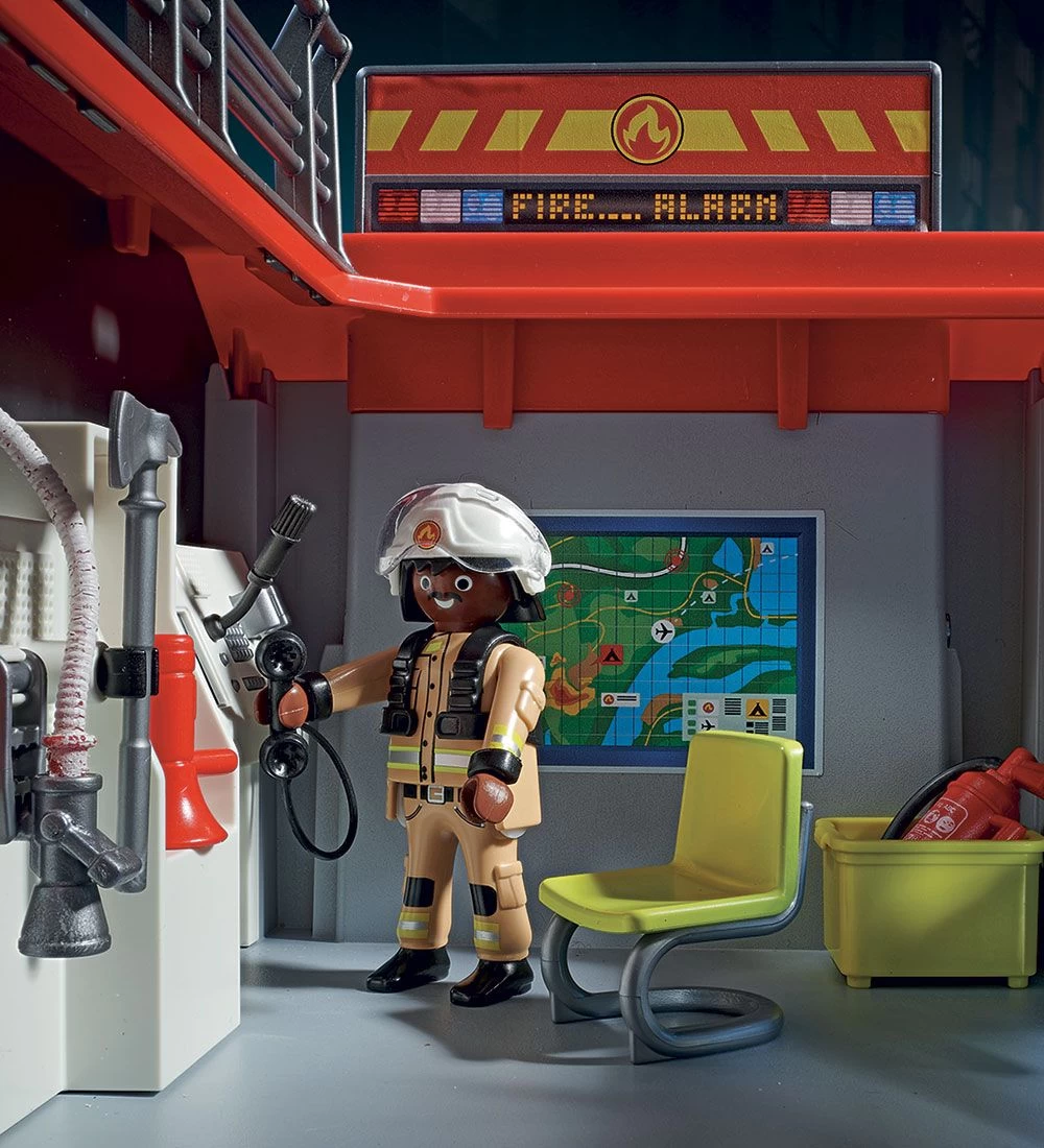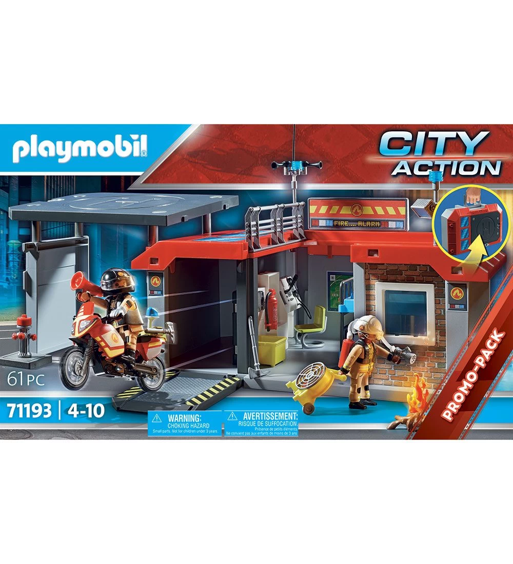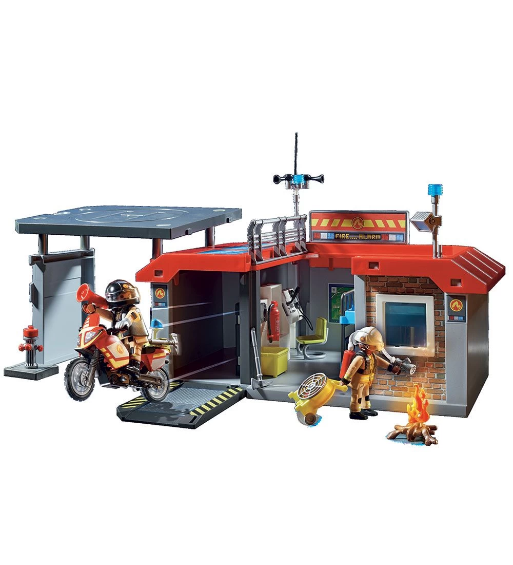 Alarmen går på den mobile brandstation, der kan foldes ud og pakkes sammen, så det kan tages med på farten. Den forreste grå plade forvandles til en helikopterlandingsplads eller en garage, og nogle vægelementer kan der blive rykkes rundt på. Der medfølger to figurer af brandfolk og også en motorcykel samt yderligere tilbehørsdele. Sættet et er en Promo-Pack, hvilket er det samme som limited edition.