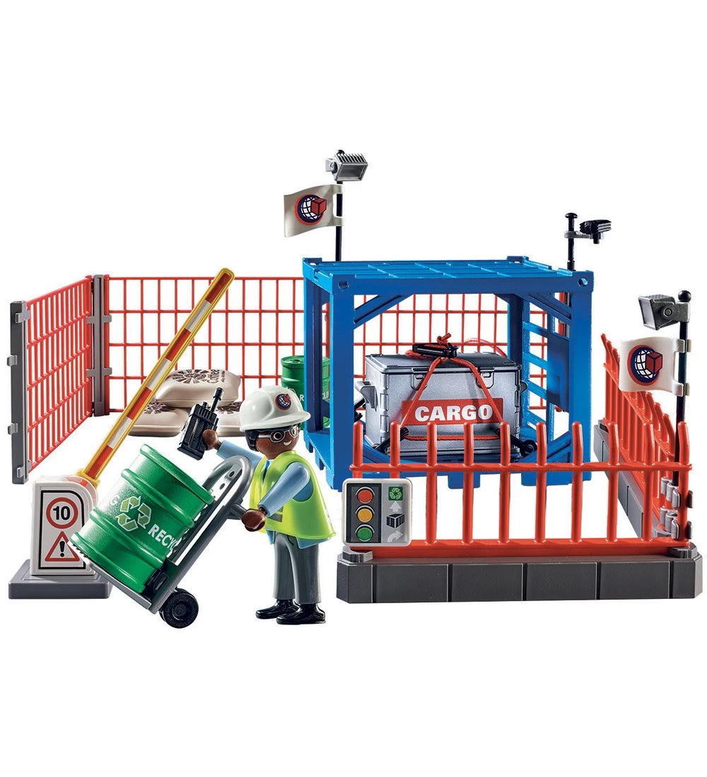 Havnearbejder-figuren flytter rundt på godset og holder opsyn med det indhegnede opbevaringsområde med en bom, der kan vippes op og ned. Sættet inkluderer både en havnearbejder-figur, hegn, en container, gods og en masse tilbehør.
