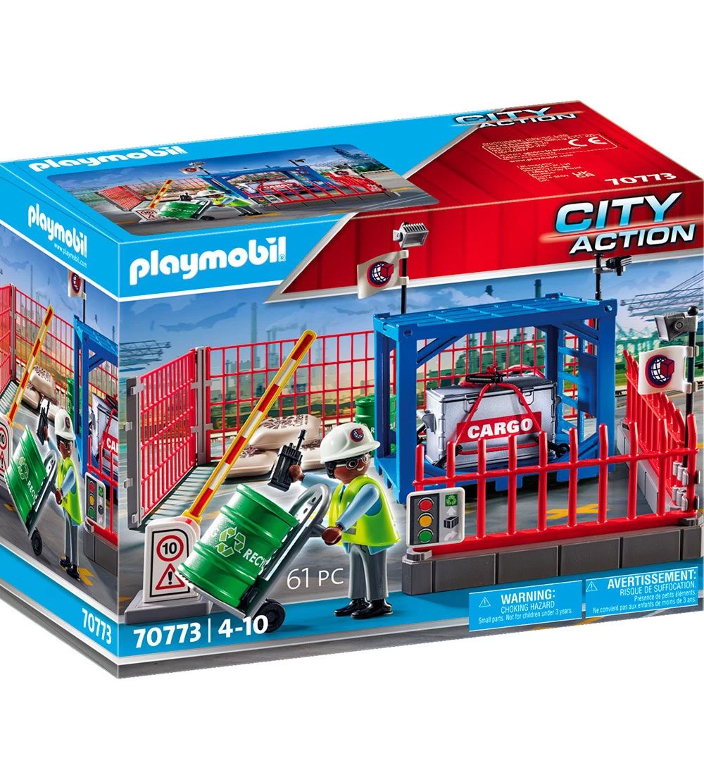 Sejt Playmobil City Action sæt med i alt 61 dele, der samles til et indhegnet område med bom til sikker opbevaring af gods.