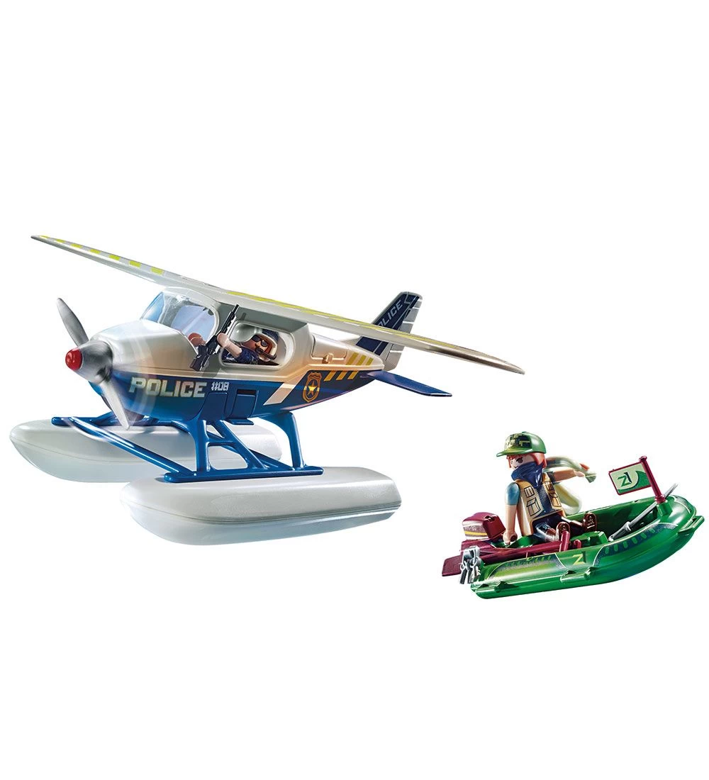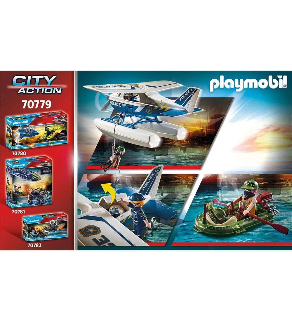 Politi-vandflyveren jagter smuglerens RIB-båd i henover vandet. Der medfølger to figurer, en politi-vandflyver, RIB-båd og yderligere tilbehørsdele.