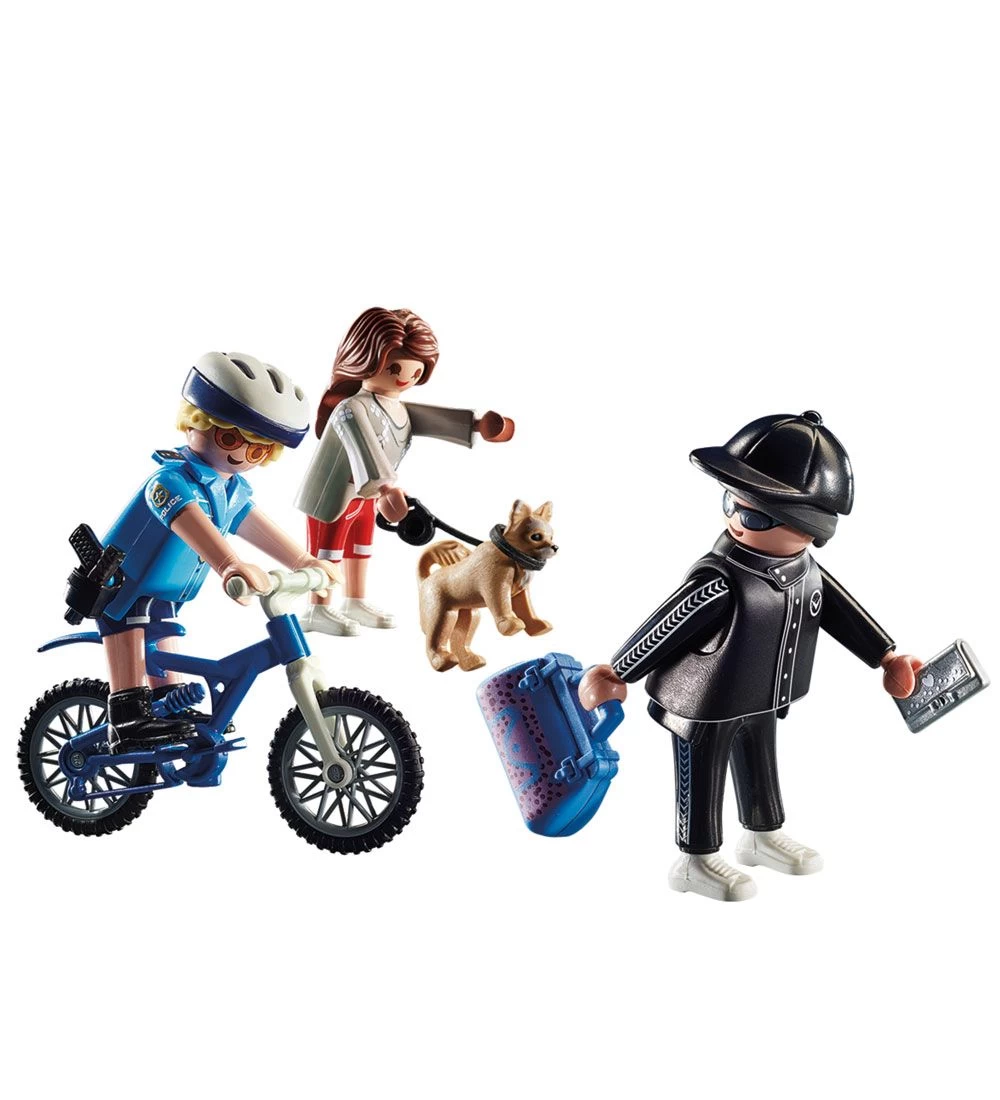 Lommetyven har bestjålet en kvinde med hund og betjenten sætter efter ham på sin politicykel. Sættet inkluderer både en betjent-figur, en lommetyv-figur, kvinde-figur med hund, en politicykel og en masse tilbehør.
