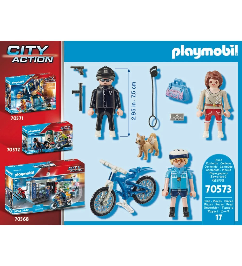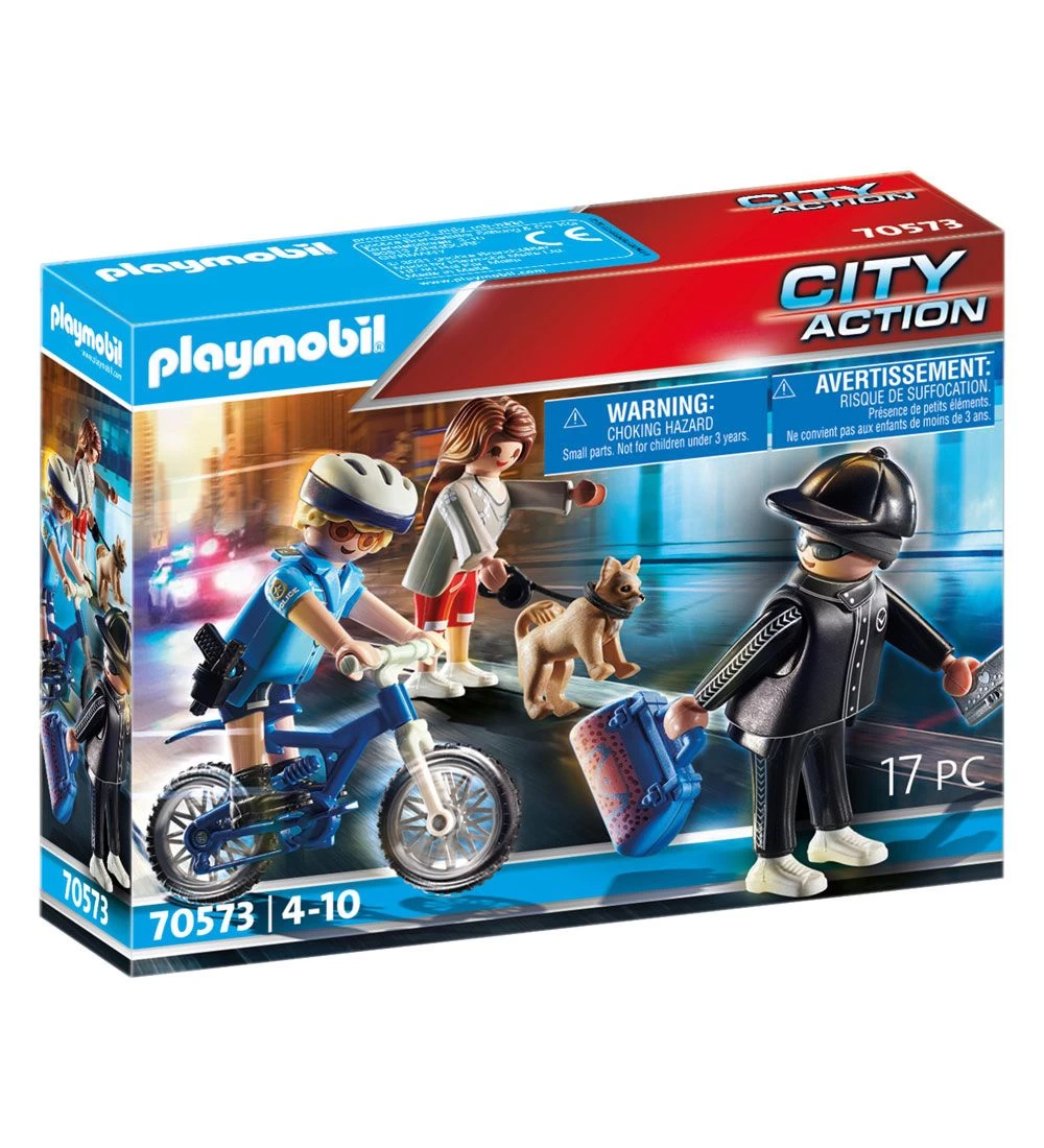 Sejt Playmobil City Action sæt med i alt 17 dele, der samles til en politibetjent på cykel, der forfølger en lommetyv.
