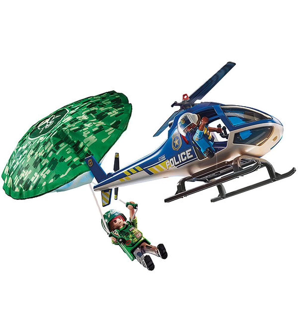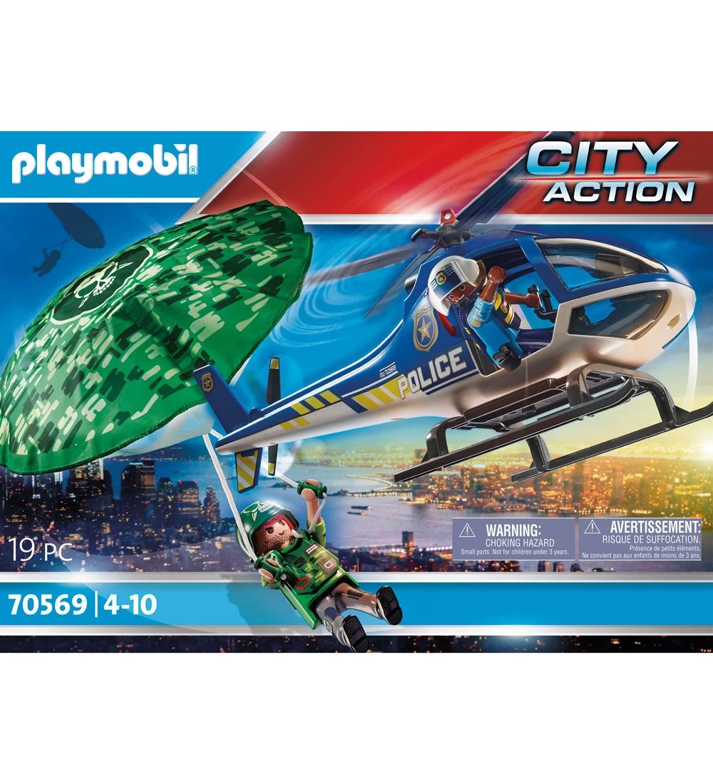Sejt Playmobil City Action sæt med i alt 19 dele, der samles til en politbetjent i sin helikopter, der forfølger en skurk, som er hoppet ud i faldskærm.