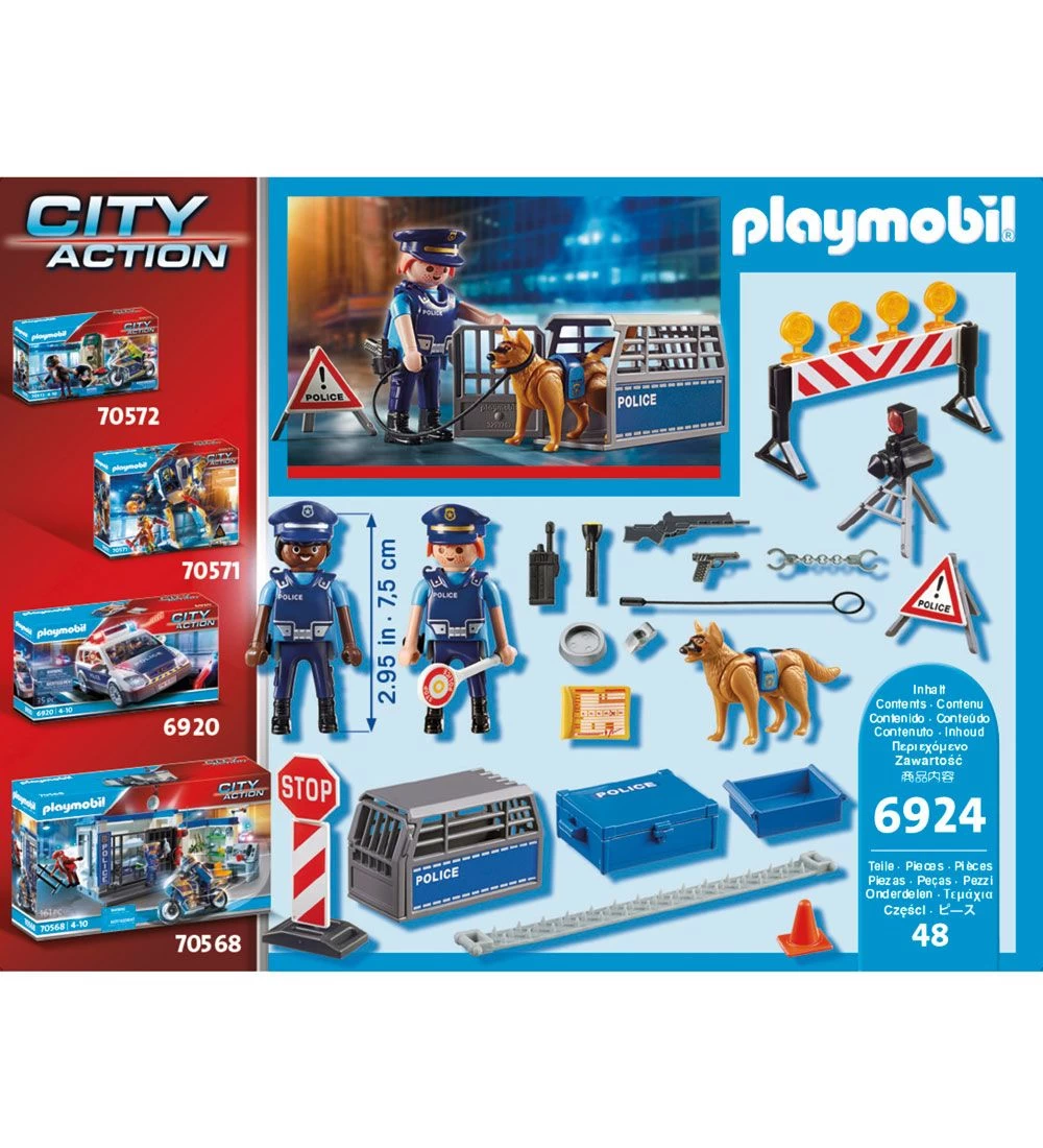 De to betjente har sat en vejafspærring op og står klar med hund og våben. Sættet inkluderer både to betjent-figurer, en politihund-figur, en vejafspærring og en masse tilbehør.