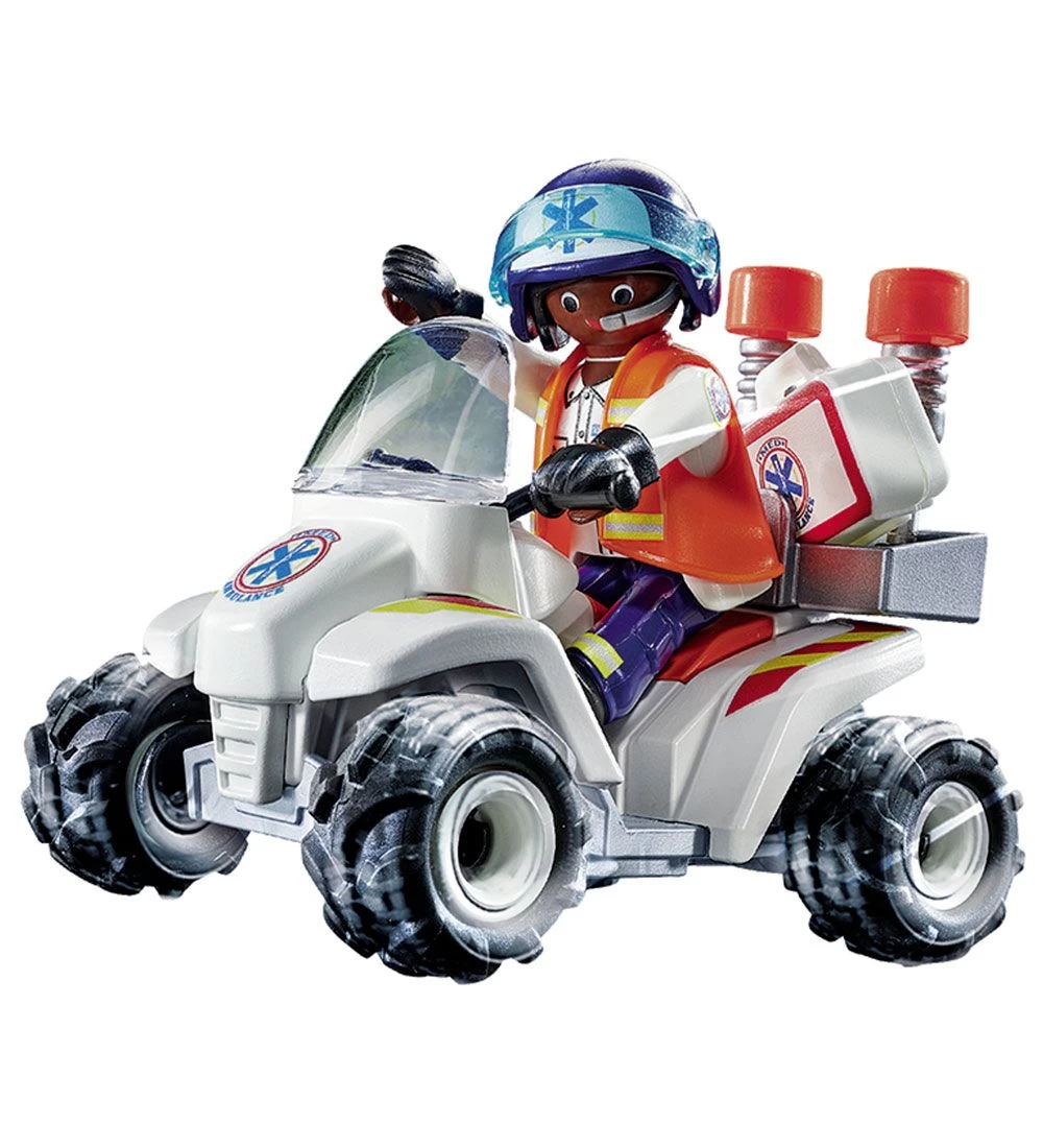 Speed Quad-redningstjenesten er med en læge-figur og tilbehør og har pull back-funktion, så den kan køre rigtigt. Sættet er en Promo-Pack, hvilket er det samme som limited edition.
