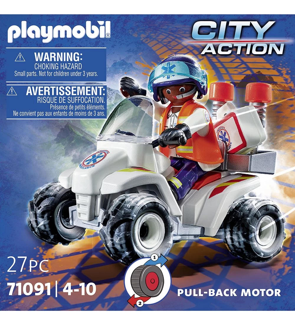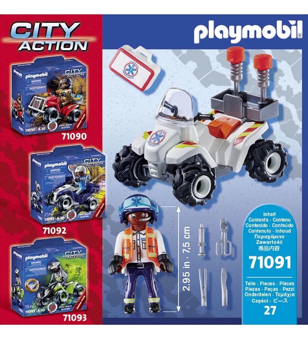 Sejt Playmobil City Action sæt med i alt 27 dele, der samles til en lynhurtig Speed Quad-redningstjeneste.