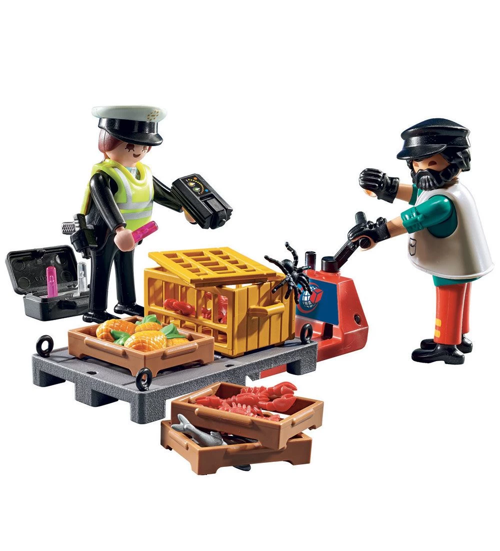 Toldkontrolløren tjekker en det indkomne gods i kasser på en palle, hvor alt ser ud til at være i ordenm indtil en stor edderkop kravler ud af den ene kasse. Sættet inkluderer både en toldkontrollør-figur, pallekører-figurer, en transportpalle, gods, en edderkop og en masse tilbehør.