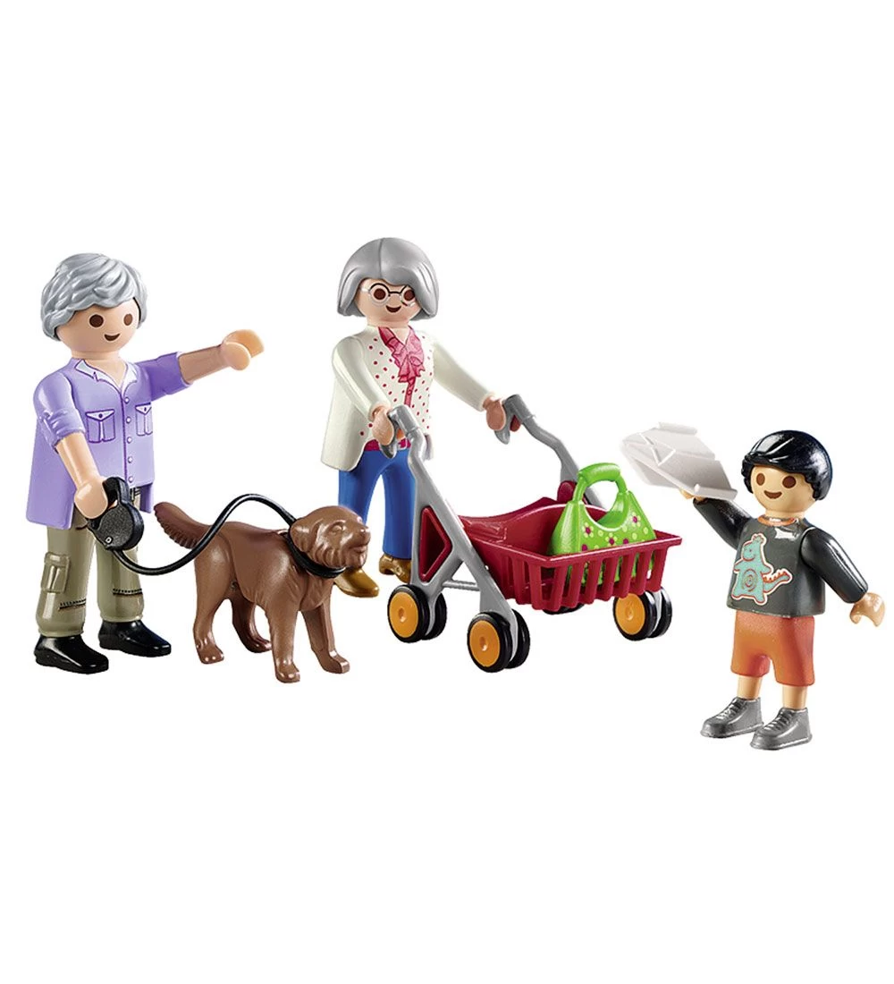 Fint Playmobil City Life sæt med i alt 14 dele, der samles til en scene, hvor bedsteforældrene går en tur med deres barnebarn og hund. Der medfølger også en rollator samt andet tilbehør.