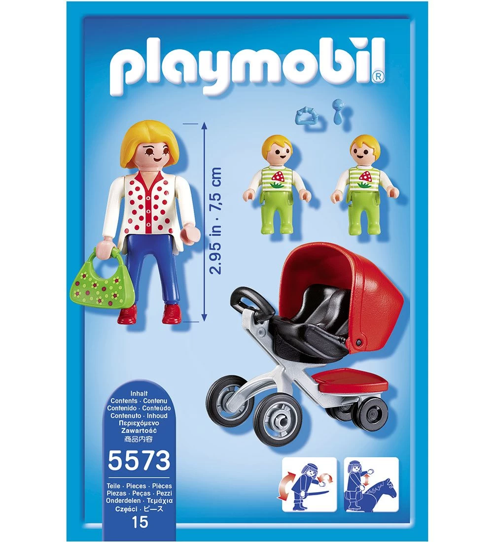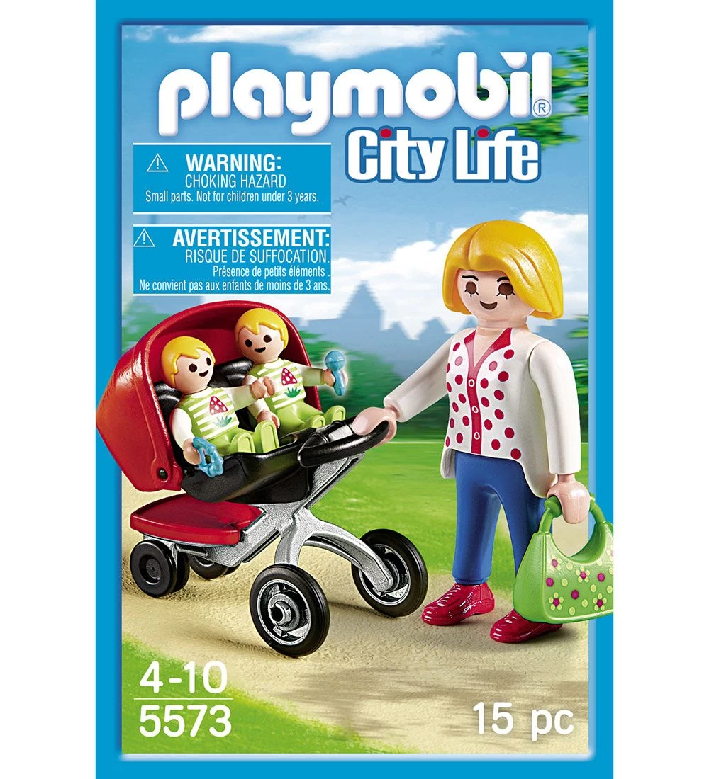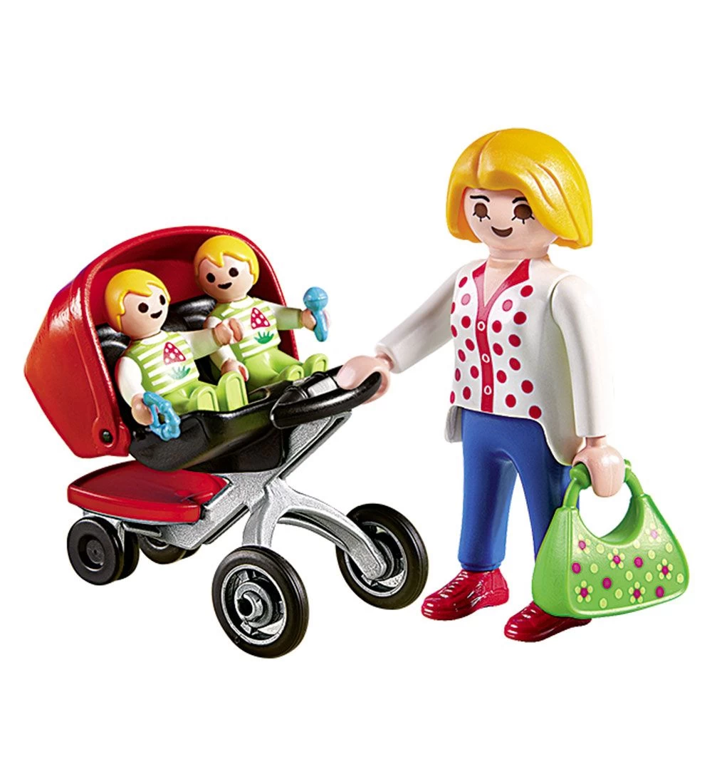 Fint Playmobil City Life sæt med i alt 15 dele, der samles til en scene, hvor en mor går en tur med sine tvillinger i tvillingeklapvognen.