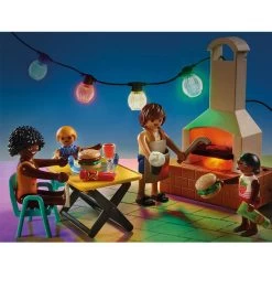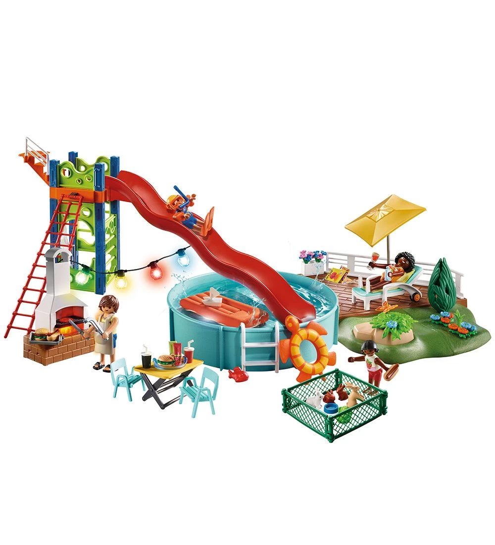 En lille familie afholder poolparty en bølgerutsjebane, en opfyldelig pool, en fungerende grill (2 x AAA-batterier påkrævet, ikke inkluderet), fungerende lanterner (kræver 1 x AAA-batteri, ikke inkluderet). Sættet inkluderer også både en mor-figur, en far-figur, en datter-figur, en søn-figur, en terrasse, en kaninindhegning og en masse tilbehør)