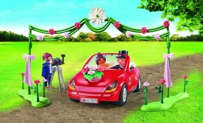 City Life startpakke fra Playmobil med en rød bryllupsbil. Den har tre figurer og et kamera med et kamerastativ, så en af figurerne kan være bryllupsfotograf. Perfekt til mange timers sjov.