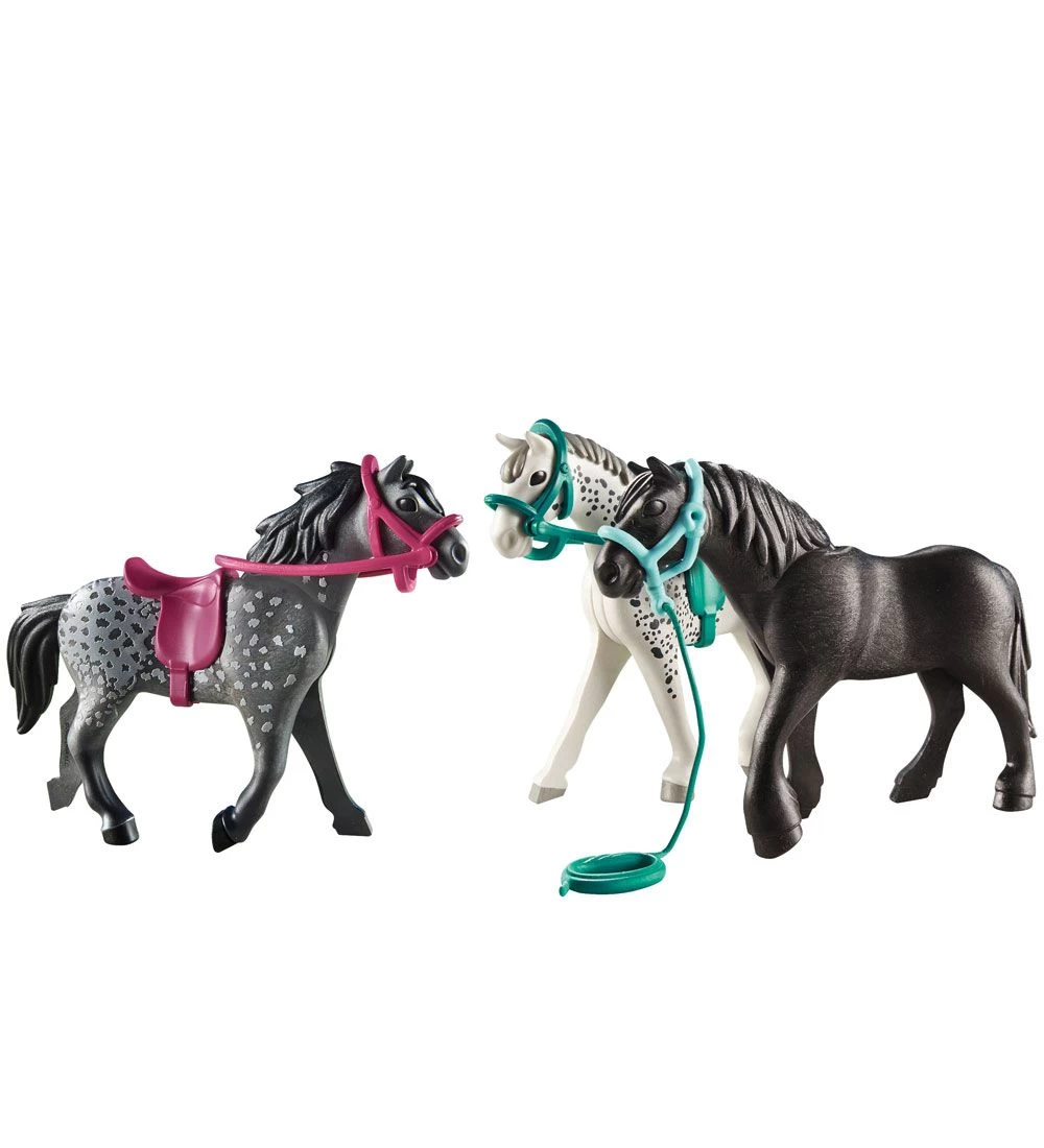 Hyggeligt Playmobil Country sæt med i alt 11 dele, der tilsammen udgør tre heste, en frieserhest, en knapstrupper, en andalusier, med tøjler og to sadler.