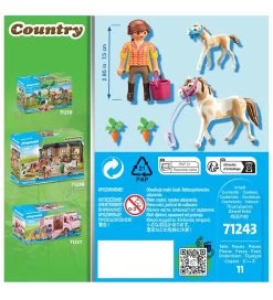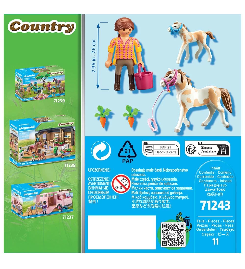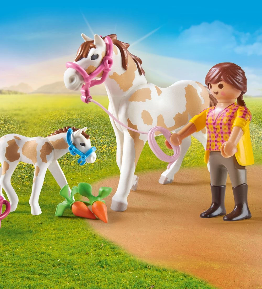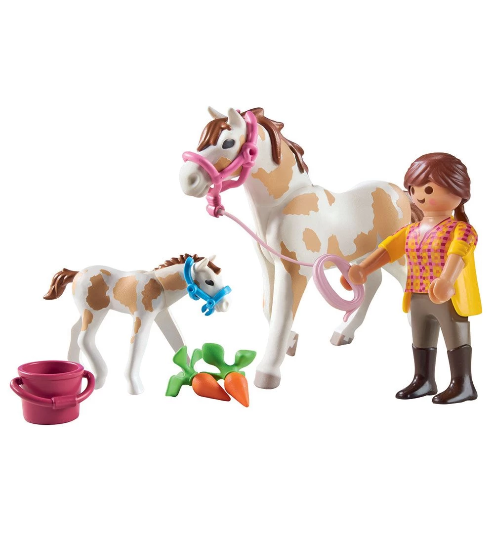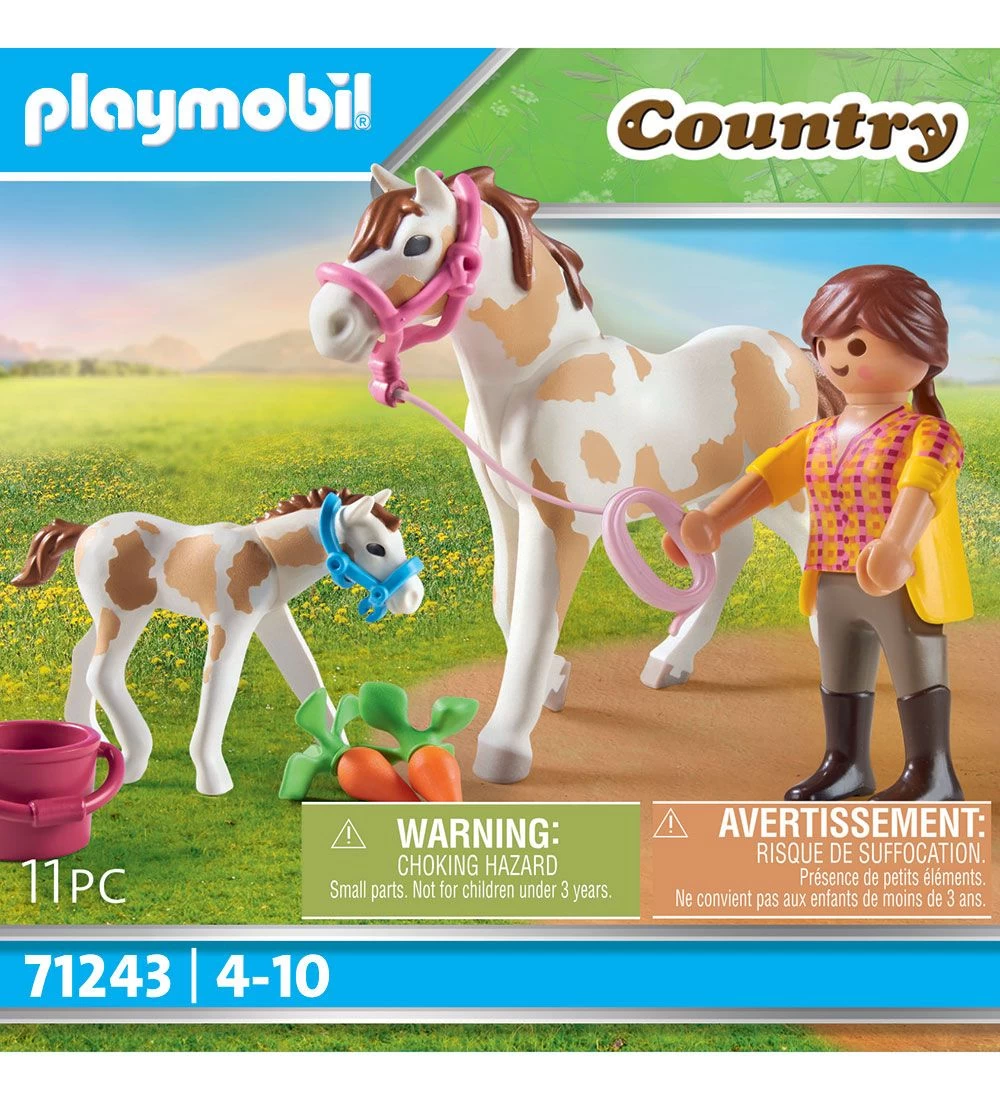 Hyggeligt Playmobil Country sæt med i alt 11 dele, der tilsammen udgør en hest med føl, en rytter-figur og tilbehør.