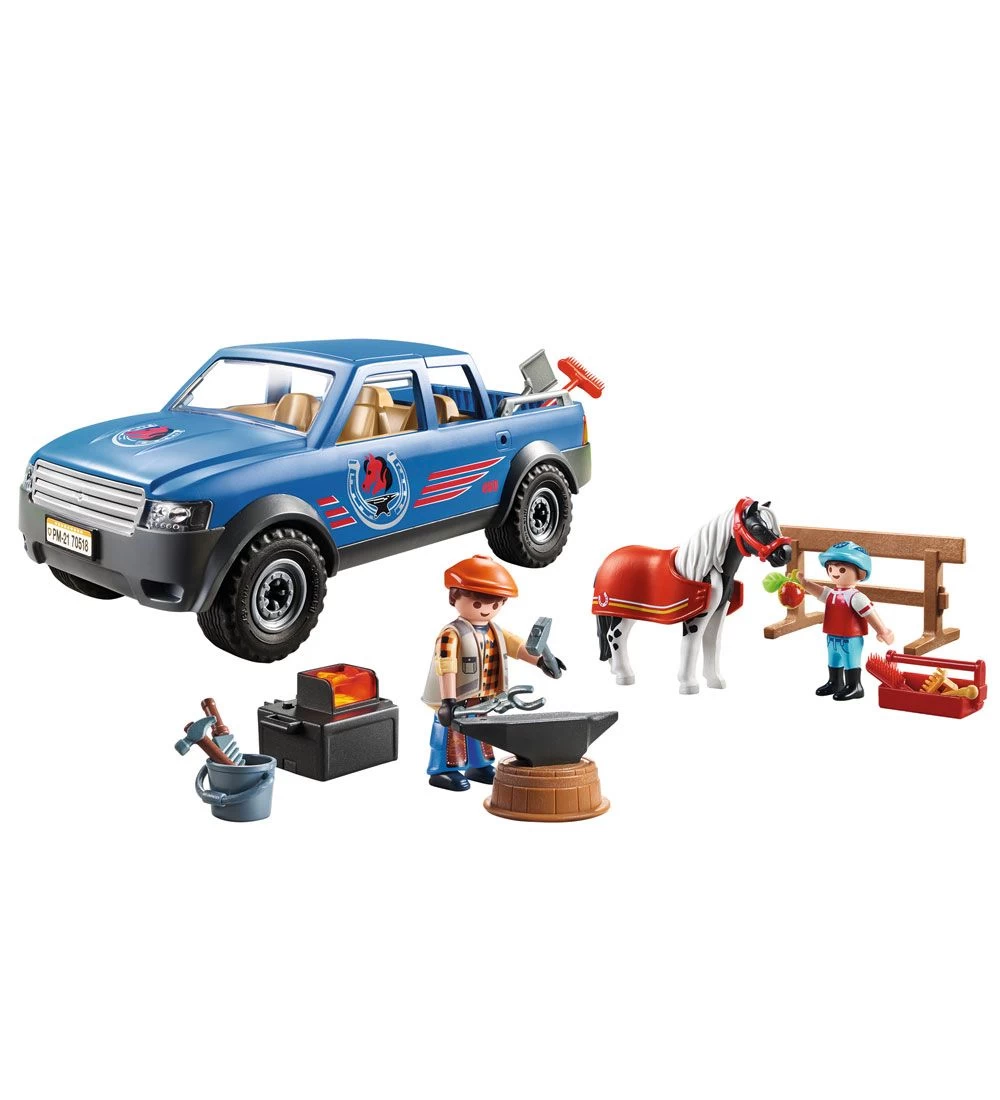 Smeden kører i sin pickup, hvor han har sit værktøj og sin mobile pejs med sig, der i øvrigt kan lyse ved et tryk på en knap, og her kan han f.eks. smede hestesko til drengens pony. Sættet inkluderer både to figurer af en smed og en dreng, en pony, en pickup og en masse tilbehør.