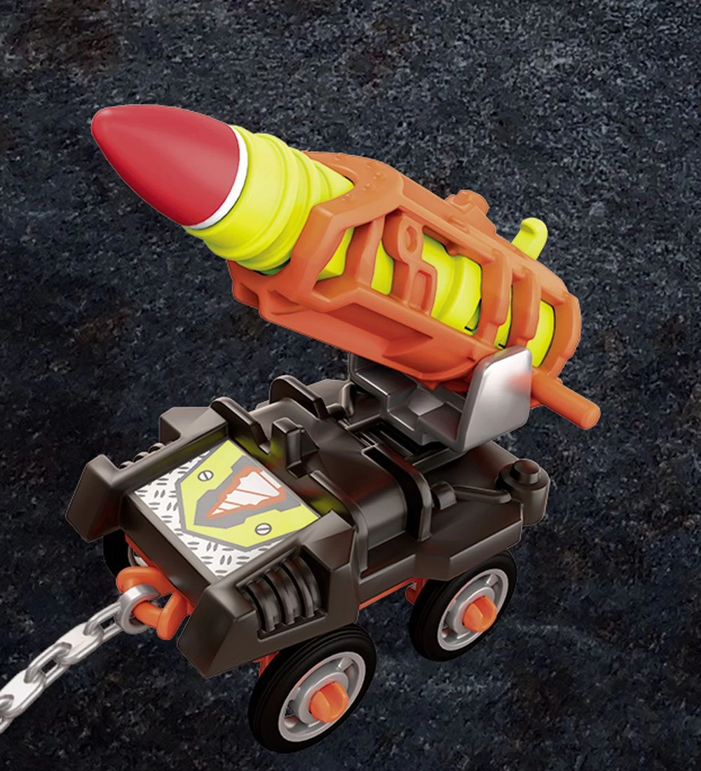Der medfølger to figurer, en raketbil med trailer og integreret kanon og massere af tilbehør.