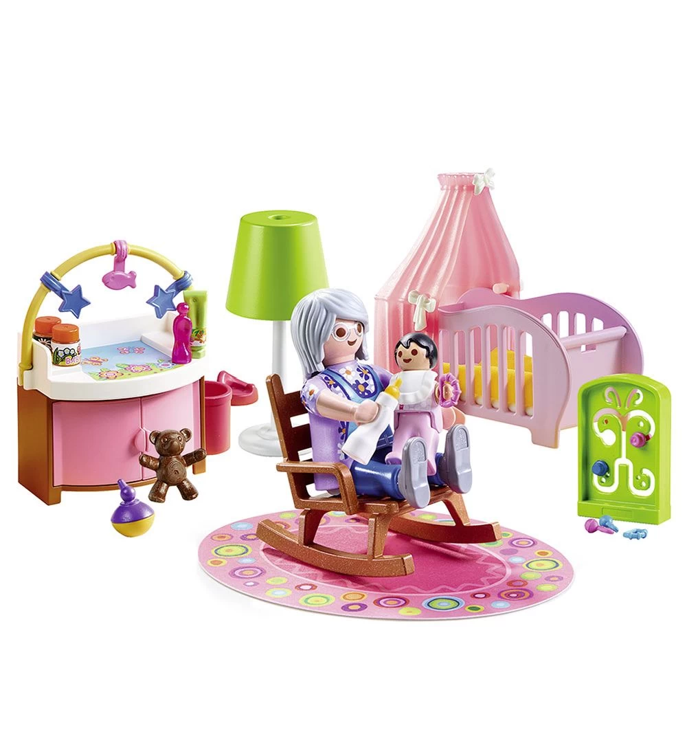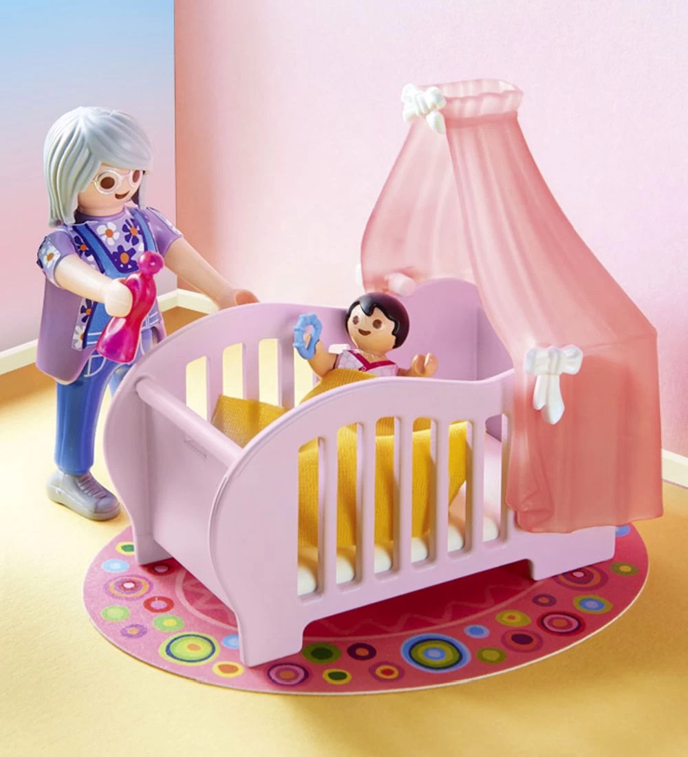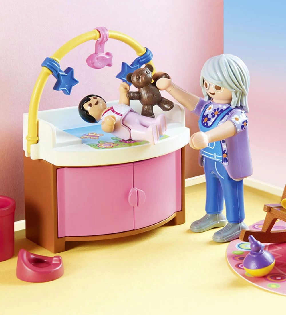 Selv det mindste medlem af familien har sit eget værelse i det store dukkehus. I børneværelset er der alt hvad en glad baby har brug for: en dejlig tremmeseng med himmel, et puslebord med aktivitetsstativ og naturligt legetøj. Når bedstemor er på besøg, sætter hun sig i den behagelige gyngestol ved siden af sengen for at fortælle historier, give mad og synge.
