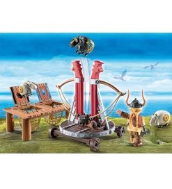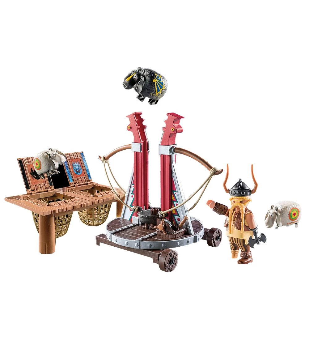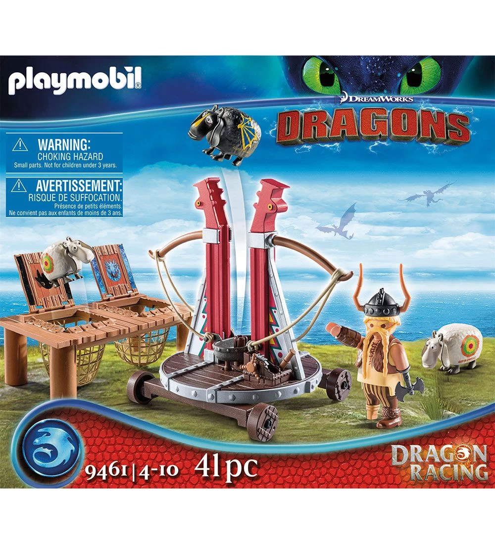 Sjovt Playmobil Dragon Racing sæt med i alt 41 dele, der samles til en træplatform med fangebur og fårekaster.