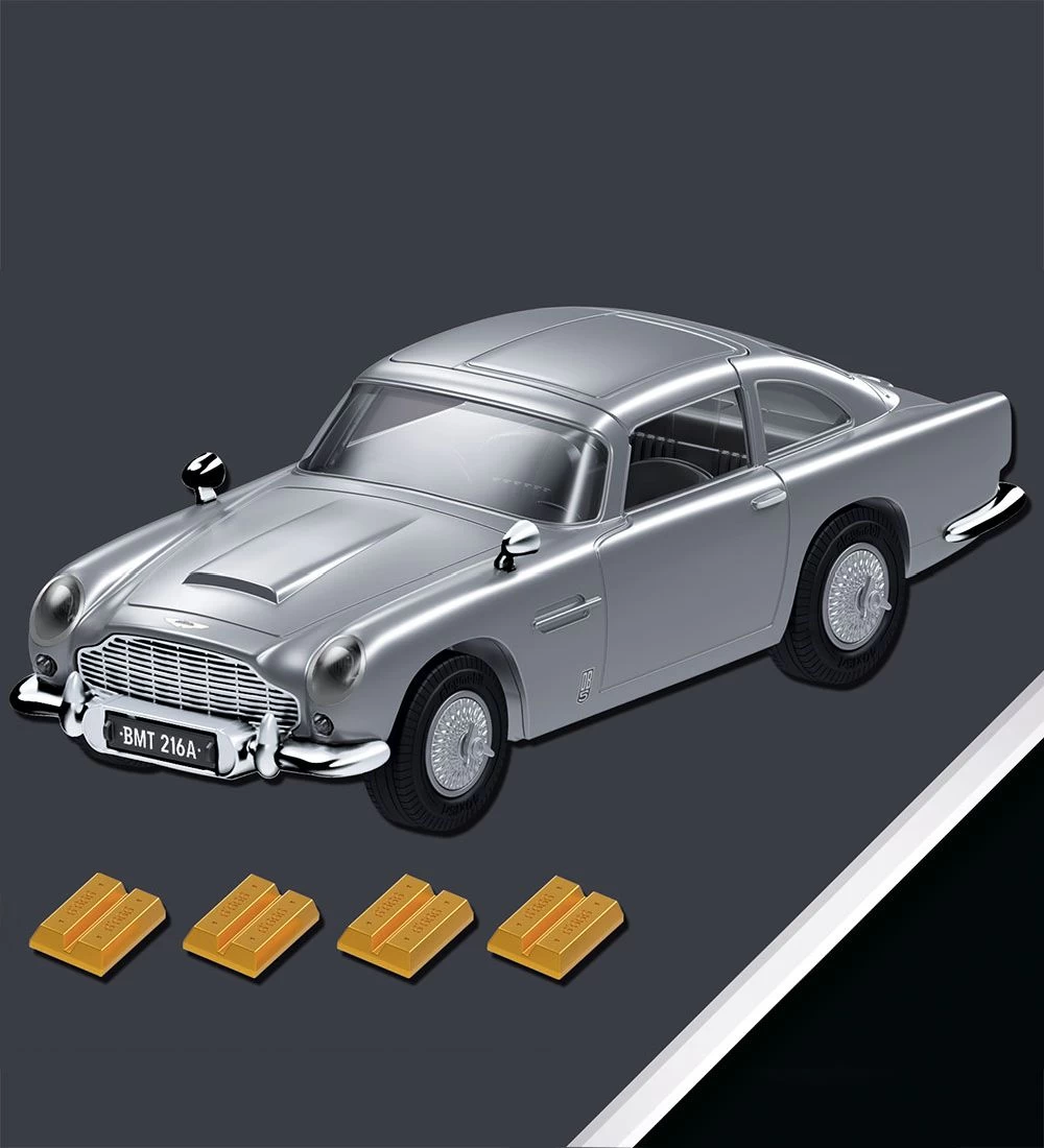 James Bonds Aston Martin DB5 er fra filmen Goldfinger (1964), med autentiske detaljer som f.eks. passagerudskydningssædet og drejbare nummerplader, alt sammen nødvendigt for at forpurre skurken Goldfingers planer. Der medfølger figurer af James Bond, Goldfinger, Oddjob og Henchman.