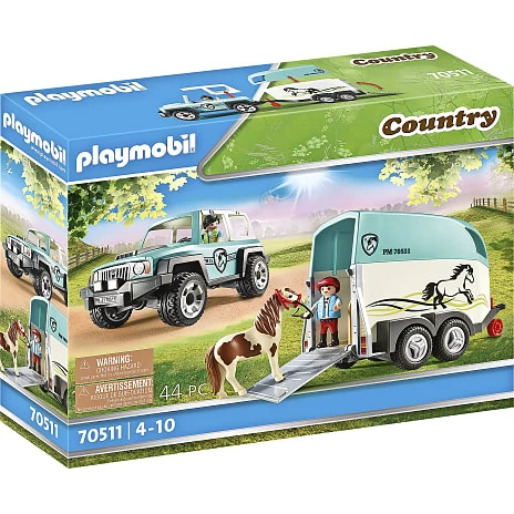 Legesættet består af en bil med ponyanhænger, to PLAYMOBIL-figurer, en pony og flere tilbehørsdele. Bilens og anhængerens tag kan tages af.