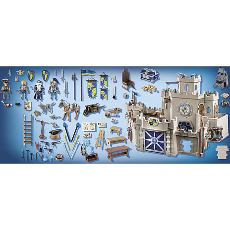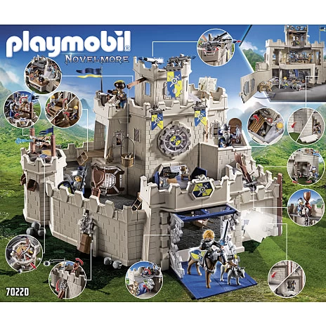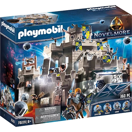 Efter årtier med fred, harmoni og stagnation i kongeriget Novelon begynder den gamle konflikt mellem de heltemodige riddere af Novelmore og de oprørske Burnham Raiders igen at blusse op. Begge parter forsøger at få fat i den magiske rustning Invincibus, som gør den, der bærer rustningen, uovervindelig. I den store Novelmore-borg bor Kong John med sin kloge og initiativrige søn Prins Arwynn, som er træt af sin fars strenge regler og hellere vil ud på eventyr. Takket være Arwynns stræben efter forandringer og ved hjælp af hans venner Gwenn og Dario er ridderne af Novelmore i stand til at klare de nye tiders alsidige udfordringer. Borgens tykke mure beskytter dem mod angreb fra Burnham Raiders, og de kan forsvare sig med sten og ballisten med vandpile. Burnham Raiders forsøger at trænge ind, men ridderne af Novelmore lukker hurtigt borgens port, og så er faren i første omgang afværget. Men kort tid senere lykkes det nogle af fjenden af trænge igennem muren og ind i borgen. Hvem vinder kampen?Den nye ridderverden fra PLAYMOBIL® overrasker med kreative våben, raffinerede forsvarssystemer og originale figurer. PLAYMOBIL®-klassikeren i et genialt nyt design sørger for sjov leg i mange timer.Den store Novelmore-borg er udstyret med en mekanisk borgport med indbygget katapult, ballist, lift og stenkaster. De indtrængende fjender kommer direkte i fangekælderen gennem faldlemmen. Sættet indeholder de fire Novelmore-figurer Kong John, Prins Arwynn, Dario da Vanci og Lord Francis Forthwind, en hest, en ulv og meget andet riddertilbehør. Med murgennembrud. Borgen har en åben bagside. Der medfølger fire figurer. Mål: 79 x 57 x 44 cm (L x D x H)