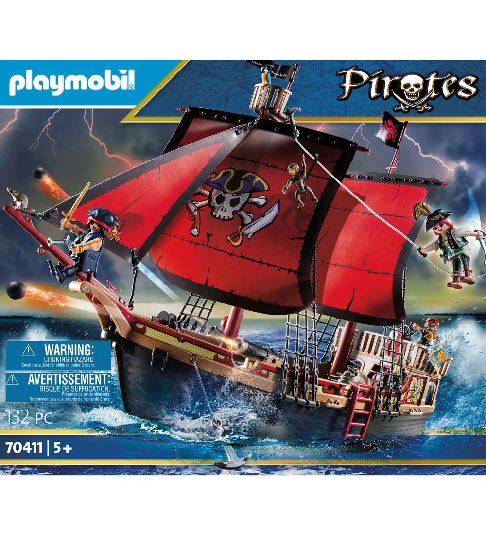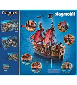 Piratskibet er stort og fyldt med massere af detaljer. På det miderste sejl er der et stort dødningehoved og skibet kan flyde i vand. Skibet har også hjul under bunden, så det også kan bruges på gulvet.