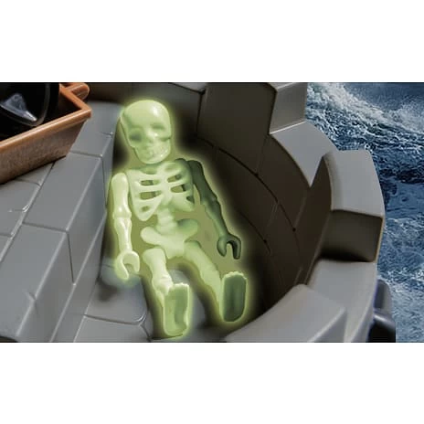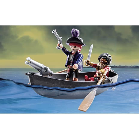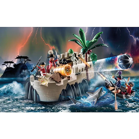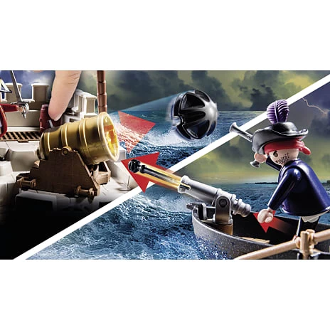 Legesættet indeholder en soldatfæstning med stor kanon, fire PLAYMOBIL-figurer, en robåd med en lille, drejelig kanon, en skattekiste med en skat og meget andet tilbehør.