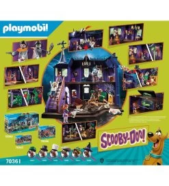 Scooby-Doo, Fred og Daphne er netop ved at afsløre spøgelseshusets hemmeligheder. Uhyggelige overraskelser lurer i mørke hjørner og knirkende gange, og de må ikke overse noget. En faldlem, en svingende lysekrone, hemmelige skjulesteder, gemte døre og en trappe, der pludselig bliver til en rutsjebane, holder holdet på tæerne. Ved hjælp af PLAYMOBIL-appen kan genfærd og spøgelser vises som hologram i stueetagen. Specialkisten kan belyse spøgelseskort, der giver oplysninger om, hvordan man fanger skurken. Kisten er desuden udstyret med uhyggelige spøgelseslyde, der gør den dystre atmosfære endnu mere frygtindgydende. Med sine to ansigter ser vampyren uhyggelig ud, men så snart vennerne endelig har gennemskuet ham, er hemmeligheden afsløret.