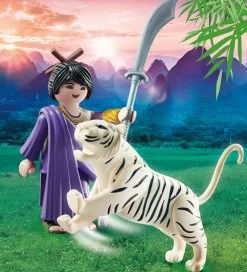 Lille Playmobil SpecialPlus sæt med i alt 6 dele, der tilsammen udgør en asiatisk, kvindelig kæmper og en hvid tiger samt tilbehør.