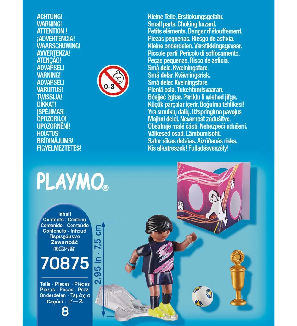 Lille Playmobil SpecialPlus sæt med i alt 8 dele, der tilsammen udgør en kvindelig fodboldspiller med målvæg og en sparkemekanisme.