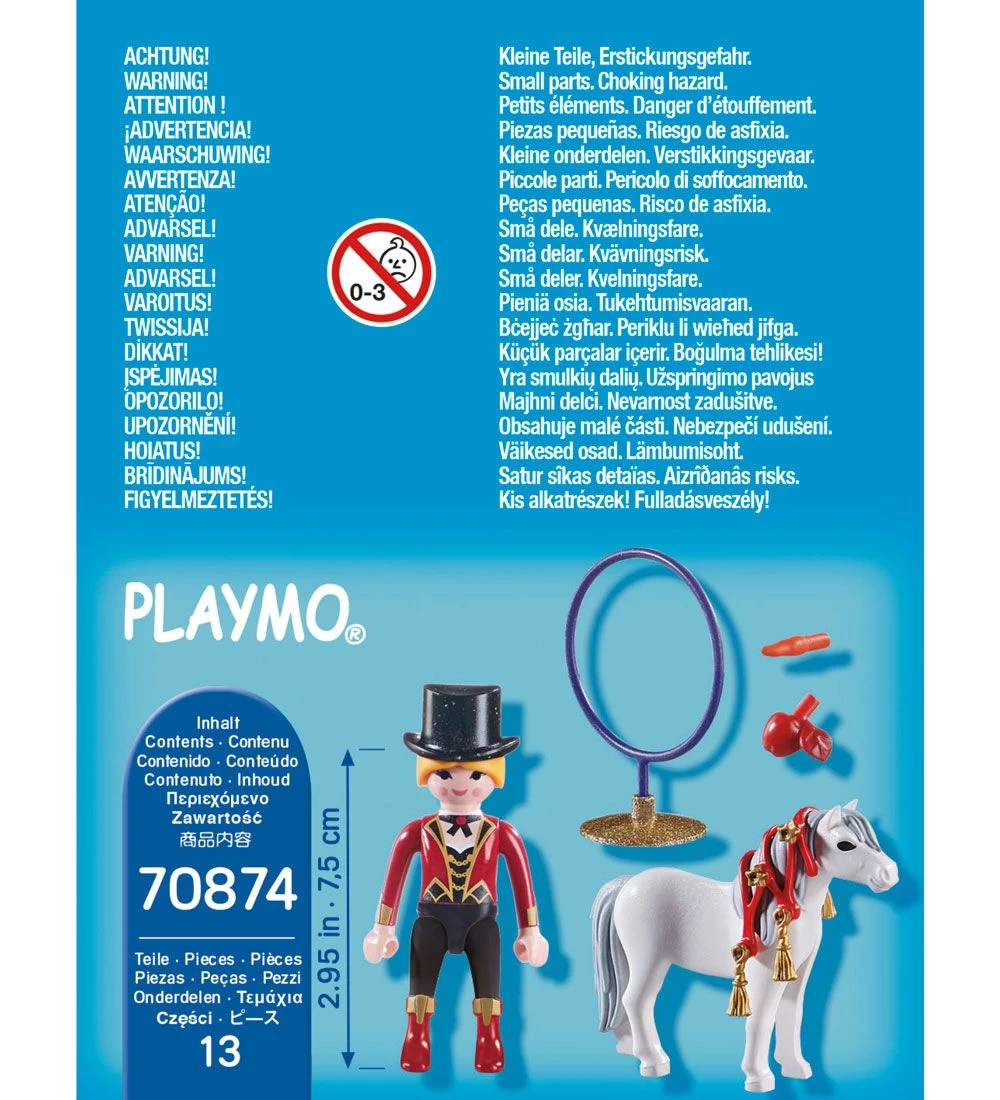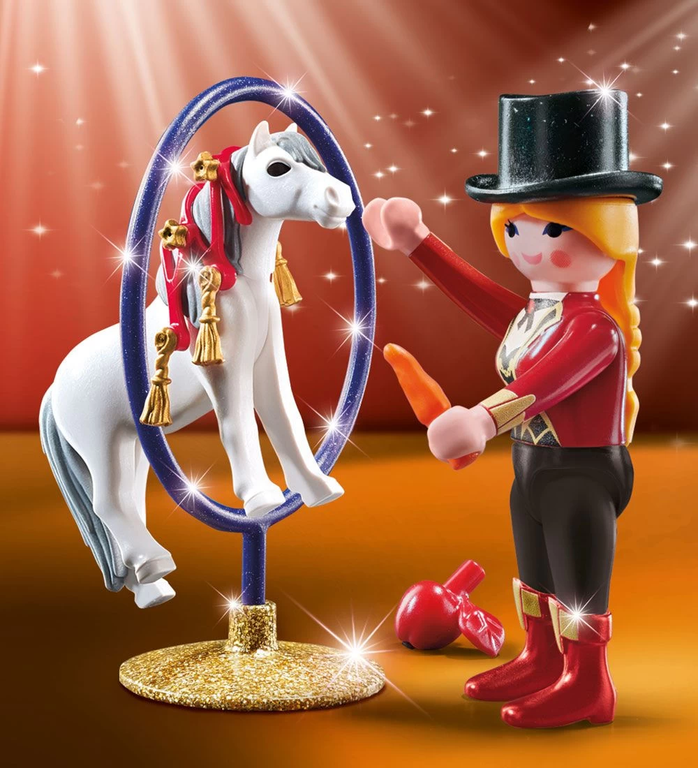 Lille Playmobil SpecialPlus sæt med i alt 13 dele, der tilsammen udgør en cirkuskvinde og -hest, der er i gang med træningen, samt tilbehør.