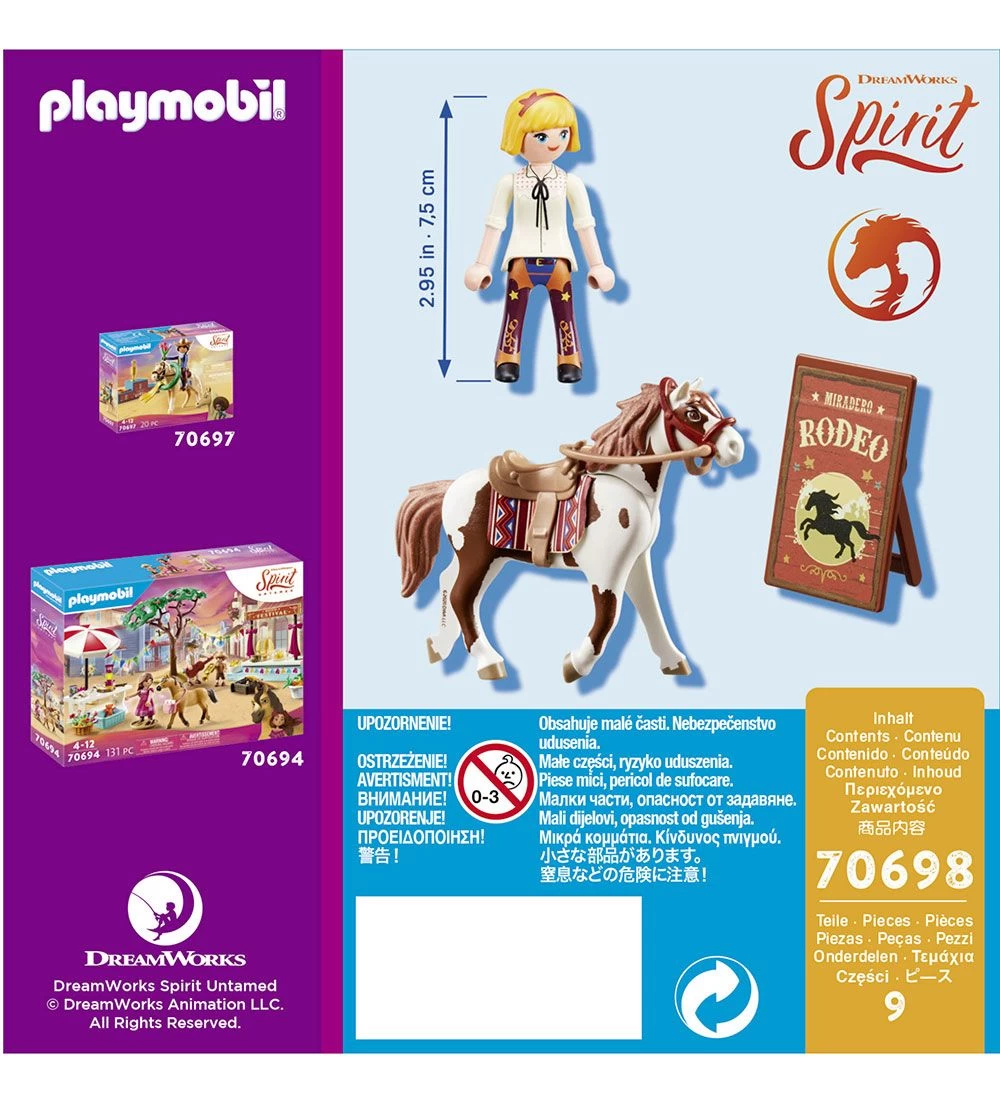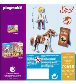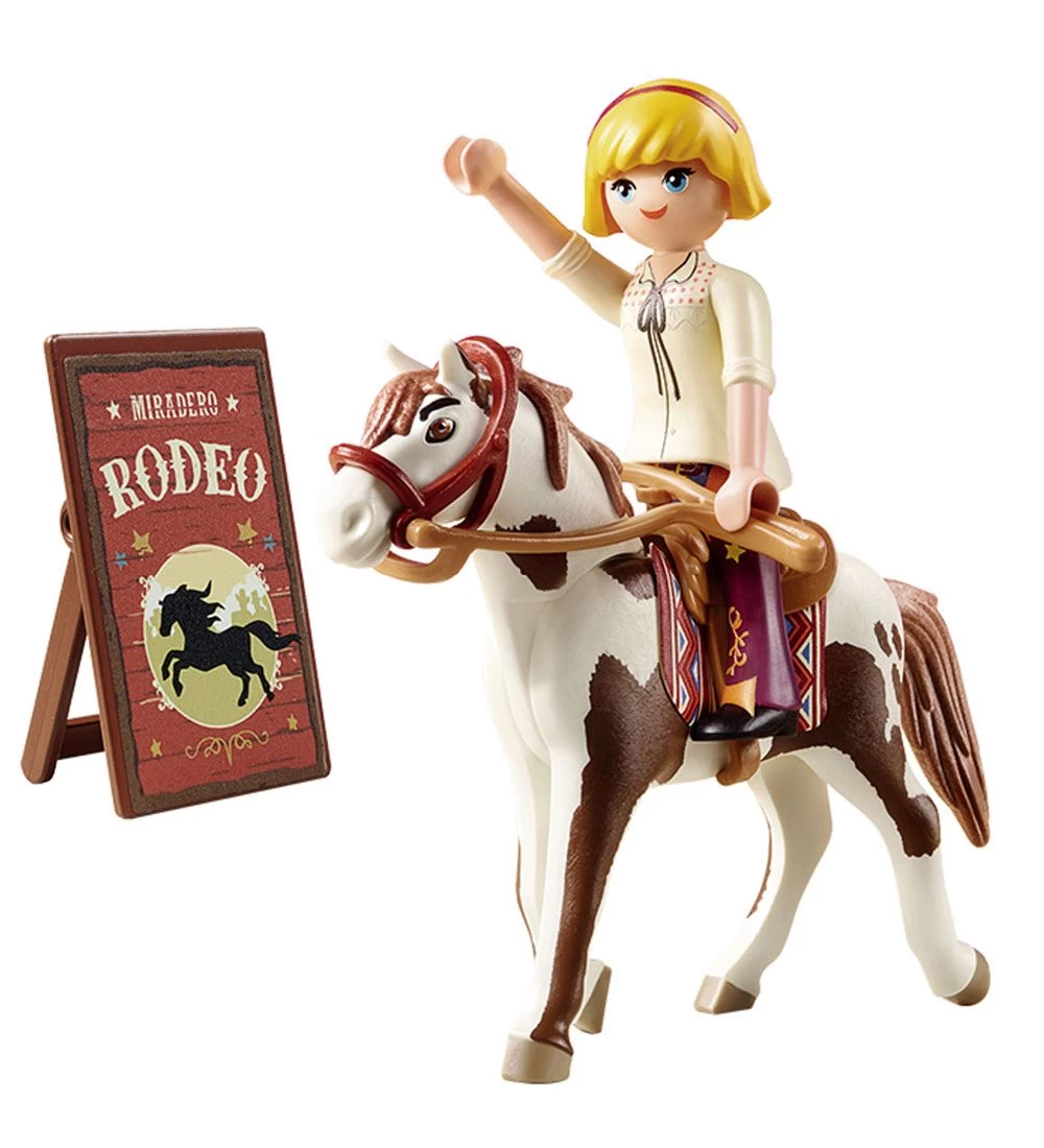 Hyggeligt Playmobil Spirit sæt med i alt 9 dele, der tilsammen udgør rodeorytteren Abigail og hendes hest Boomerang med tilbehør fra Dreamworks-filmen Spirit Untamed.