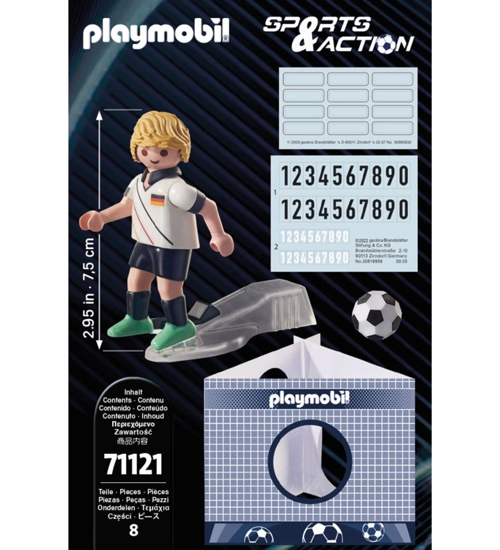 Der medfølger klistermærker, så fodboldspilleren kan gives navn og nummer. Sættet kan kombineres med Playmobil Sports & Action sættet “Fodboldstadion – 71120”.