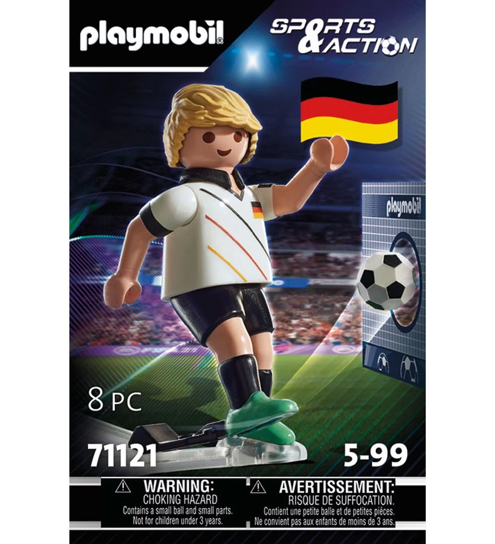 Lille Playmobil Sports & Action sæt med i alt 8 dele, der tilsammen udgør en fodboldspiller fra Tysklands landshold med en smart sparkemekanisme og en målvæg til skudtræning.