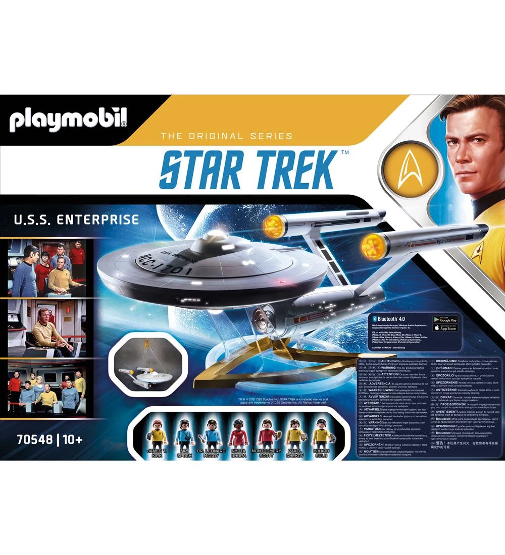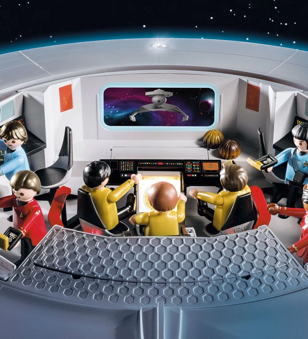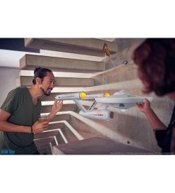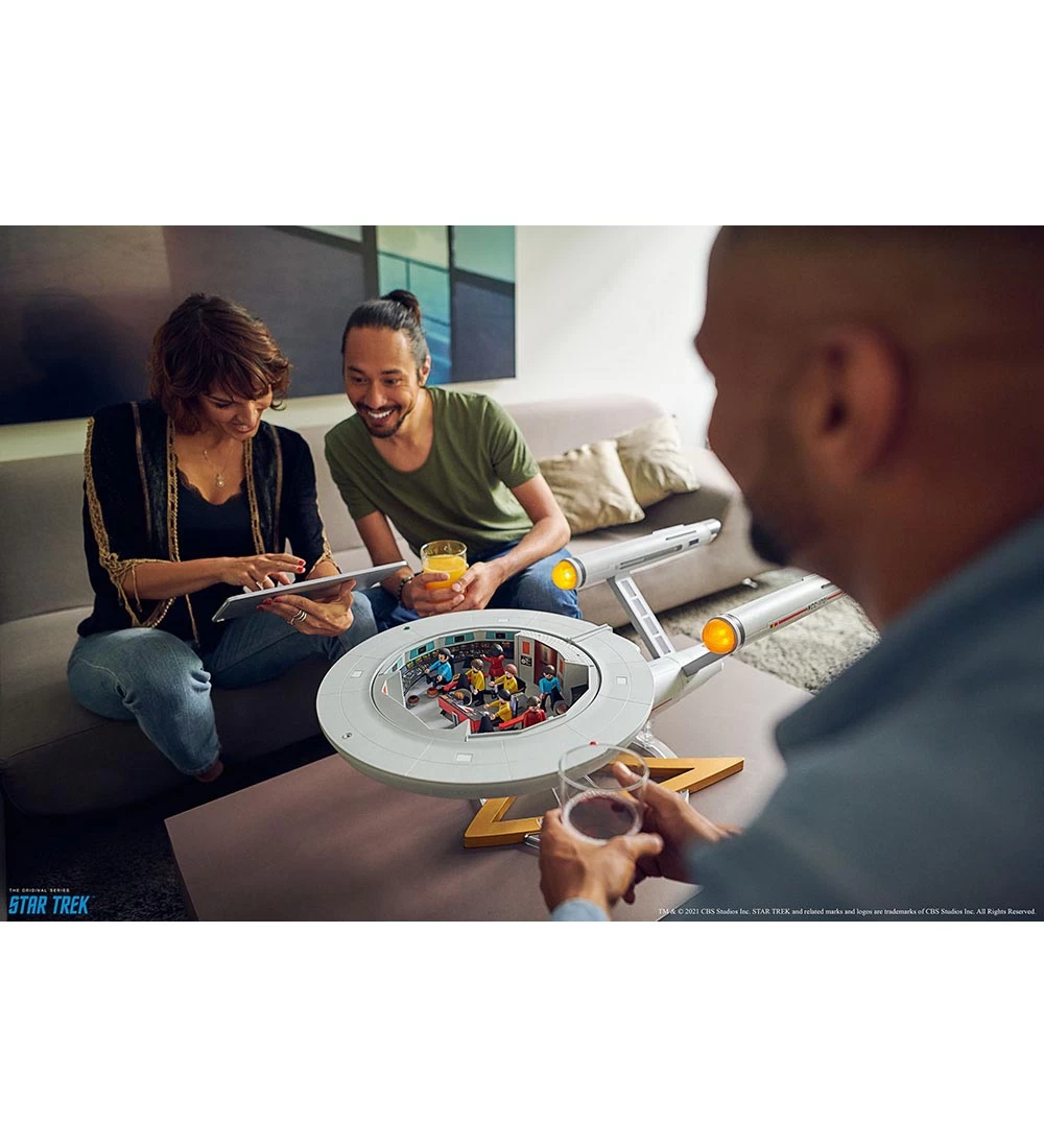 Gå på opdagelse i de særlige kendetegn ved U.S.S. Enterprise NCC-1701: Med originale lyde og replikker fra serien. Med mobiltelefonholder til hovedskærmen så man kan se film. Dilithiumkernen skal placeres på den dertil indrettede plads i maskinrummet for at aktivere elektronikken til lys og lyd. På den måde kan der simuleres en fejl i ”warp core”. Hvis stenen fjernes, starter en alarm. De tre knapper på broens midterkonsol aktiverer lyd- og lyssekvenser: Blå knap: warp-drev, rød knap: alarm, sort knap: torpedo. Med USB-C-stik som alternativ strømforsyning. Modellen kan placeres på en stander eller hænges op ved hjælp af et ophængssystem, som begge dele følger med.
